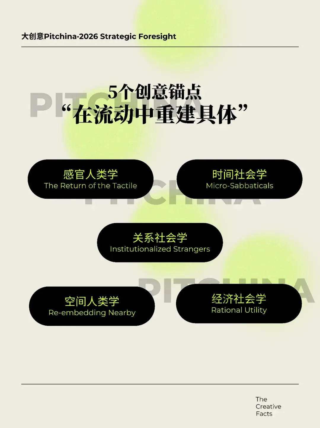 基于对全球200+品牌实践、社交媒体情绪图谱、消费行为数据及社会学理论的交叉分析,《2026创意趋势深度报告:从流动的焦虑,到具体的重建》提出五大核心趋势,共同指向一个主题:在流动中重建具体。
