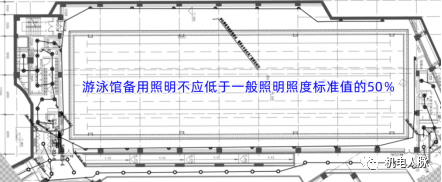 进行游泳馆照明设计时,依据GB55016-2021规范要求,其备用照明最低标准不应低于100lx(等级I)。以前常见做法是仅在泳池四周设置疏散照明(最低照度要求不小于10lx,疏散照明兼做备用照明从技术上也不合理),泳池场地照明按照三级负荷单路供电设计,不满足GB55016-2021第3.3.11条要求。