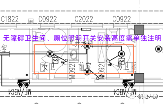 照明开关、空调开关安装要求通常在图例表中表示,对无障碍卫生间内照明开关安装高度的特殊要求,经常被电气设计人员忽视,用了一个图例表中的普通开关。这种开关安装高度一般不低于1.3m,不满足GB55019-2021第3.1.6条要求。