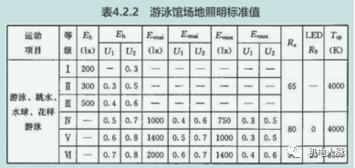 依据《体育场馆照明设计及检测标准》JGJ 153-2016,游泳馆一般照明照度标准值见下表: