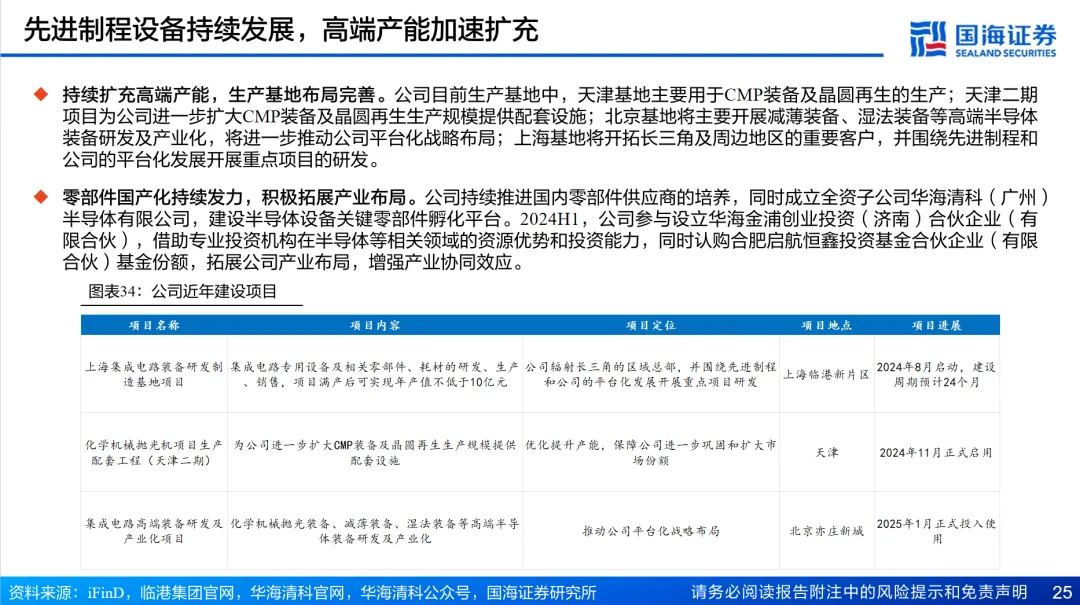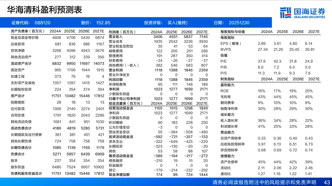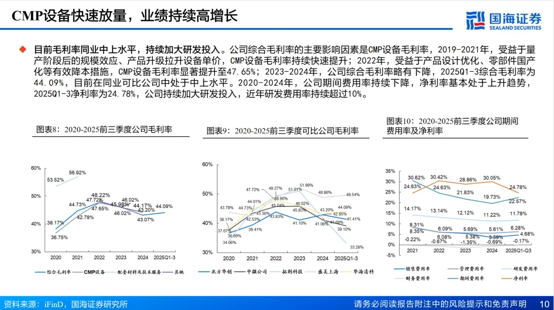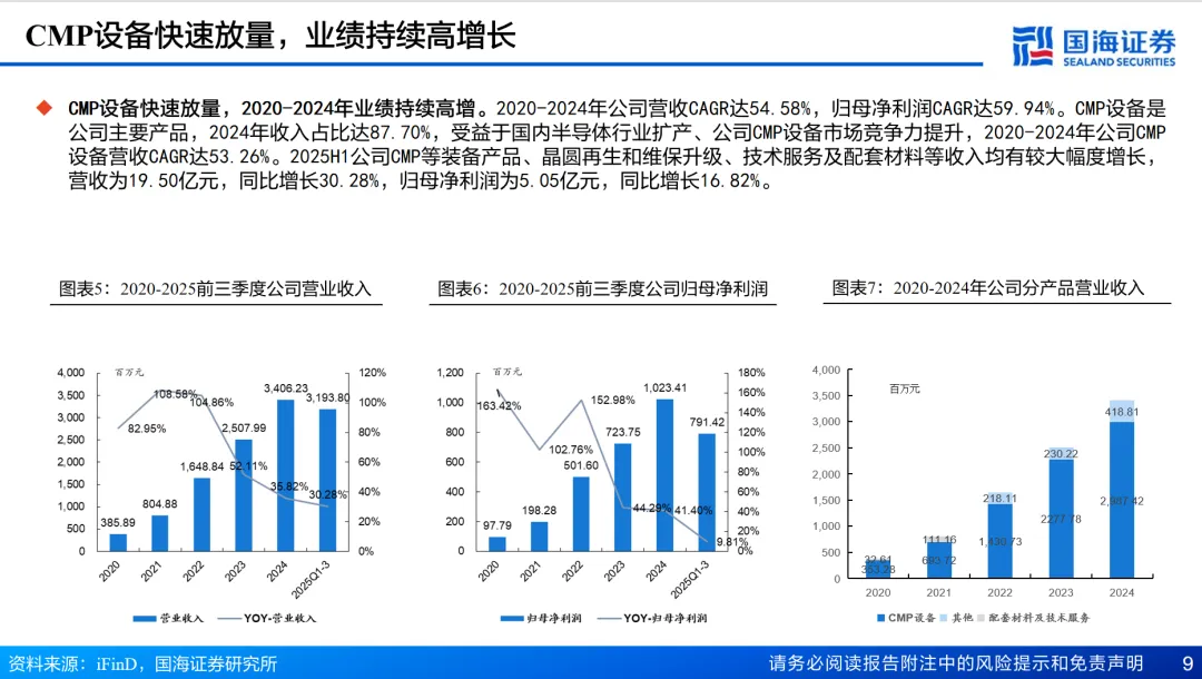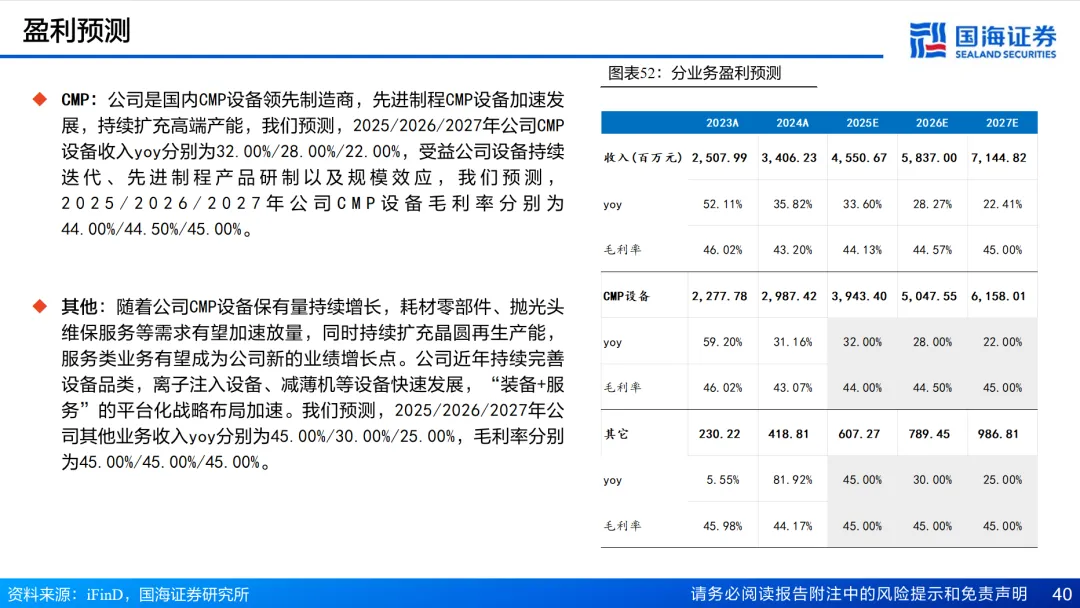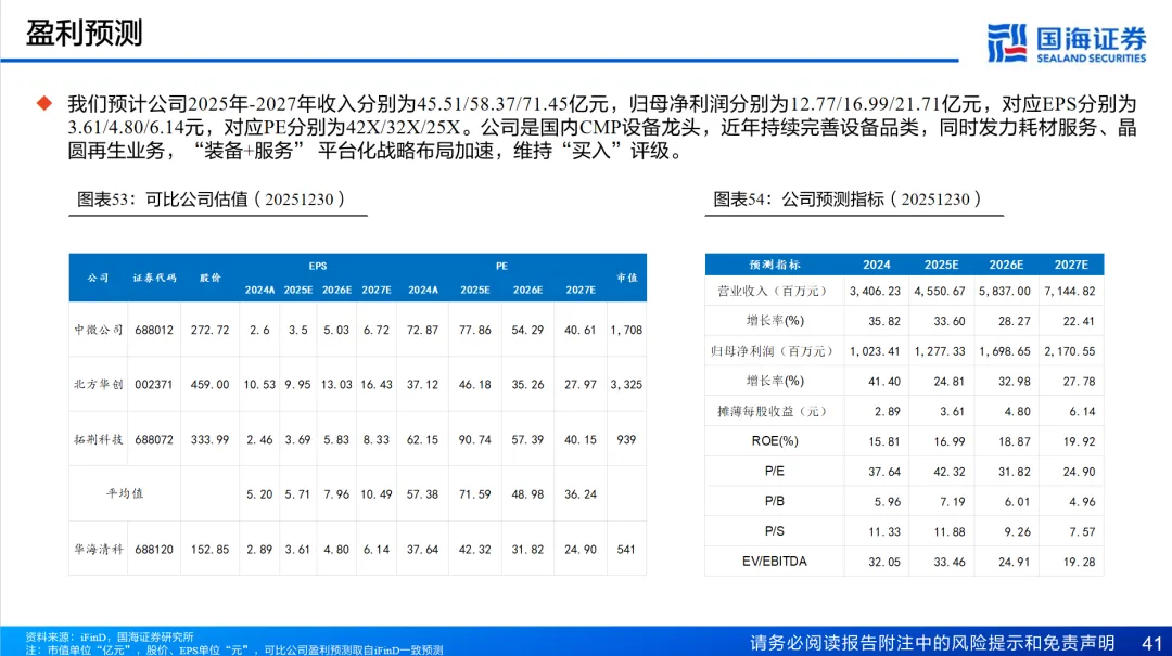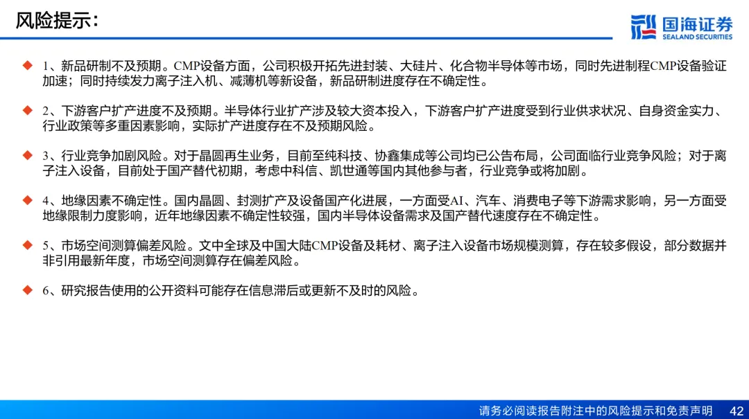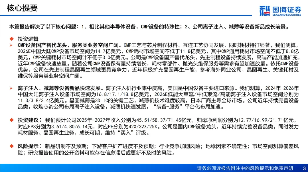 投资建议:我们预计公司2025年-2027年收入分别为45.51/58.37/71.45亿元,归母净利润分别为12.77/16.99/21.71亿元,对应EPS分别为3.61/4.80/6.14元,对应PE分别为42X/32X/25X。公司是国内CMP设备龙头,近年持续完善设备品类,同时发力耗材服务、晶圆再生业务,成长可期,维持“买入”评级。
