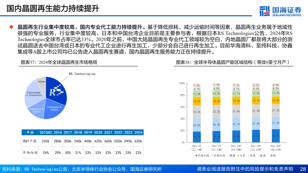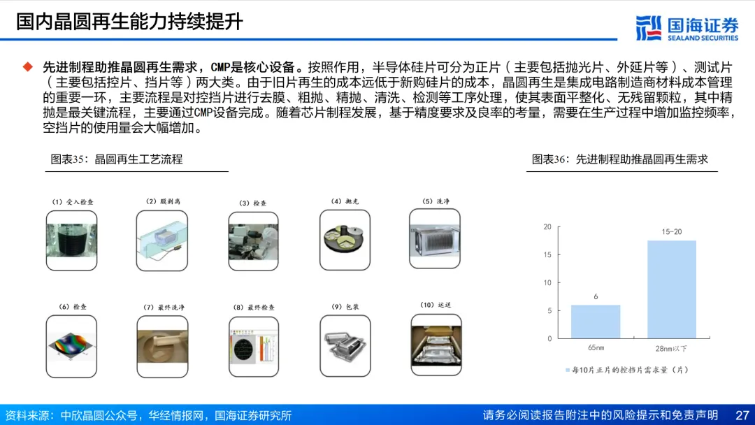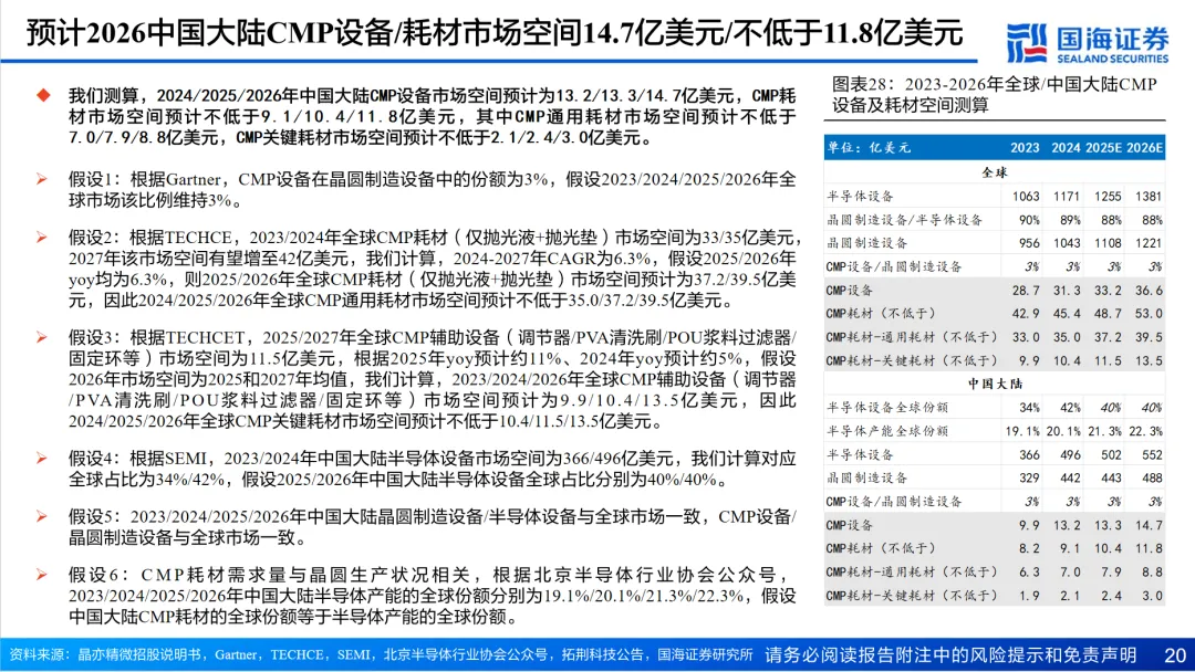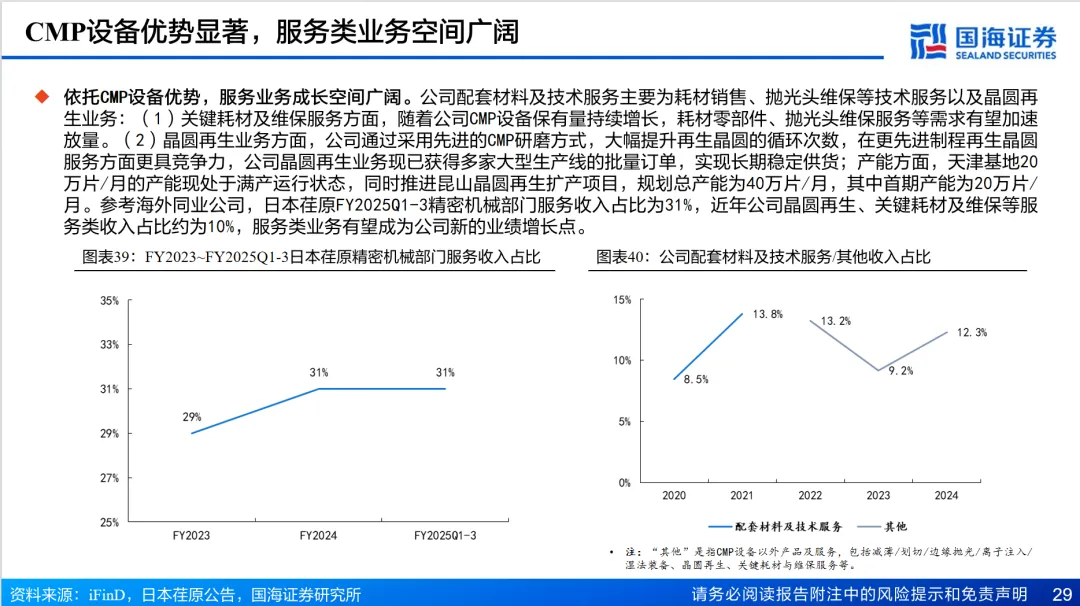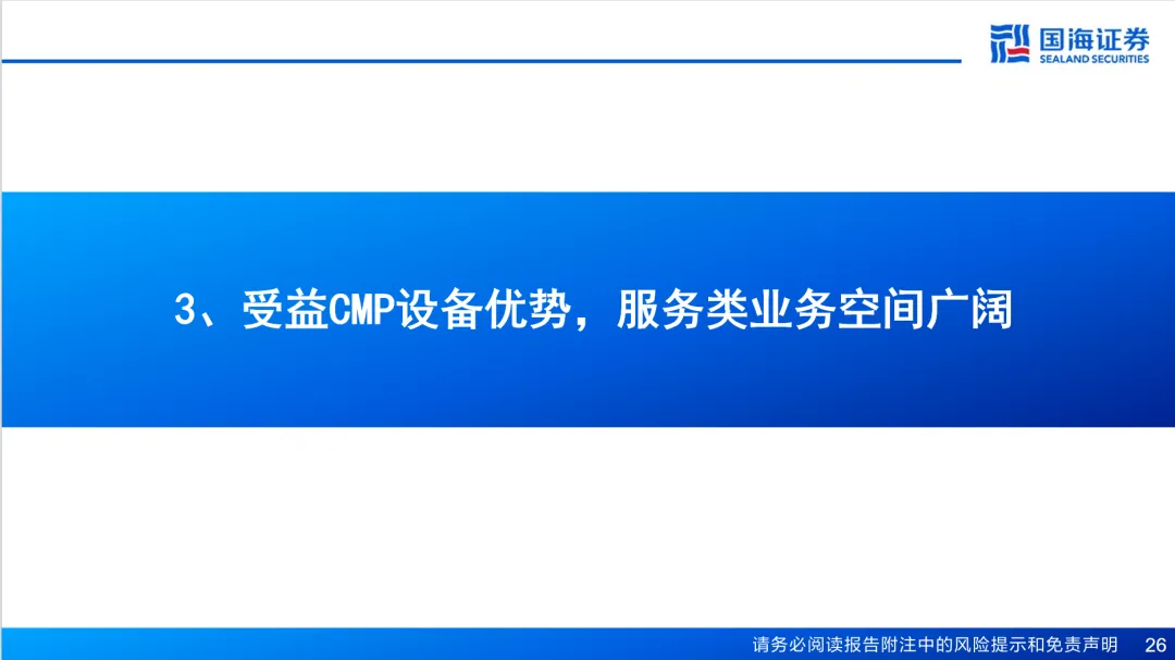 CMP设备国产替代龙头,服务类业务空间广阔。CMP工艺与芯片制程材料、互连工艺协同发展,同时耗材特征显著,我们测算,2026E中国大陆CMP设备市场空间为14.7亿美元,CMP耗材市场空间不低于11.8亿美元,其中CMP通用耗材市场空间不低于8.8亿美元,CMP关键耗材市场空间计不低于3.0亿美元。公司是CMP设备国产替代龙头,先进制程设备持续发展,高端产能加速扩充,近年CMP设备快速放量。随着公司CMP设备保有量持续增长,耗材零部件、抛光头维保服务等需求有望加速放量。依托CMP设备优势,公司在先进制程晶圆再生领域更具竞争力,近年积极扩充晶圆再生产能,参考海外同业公司,晶圆再生、关键耗材及维保等服务类业务空间广阔。