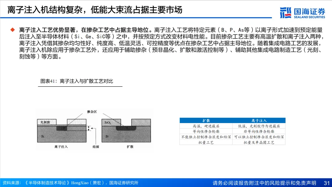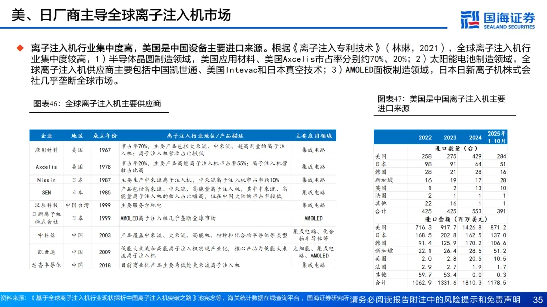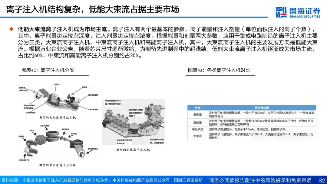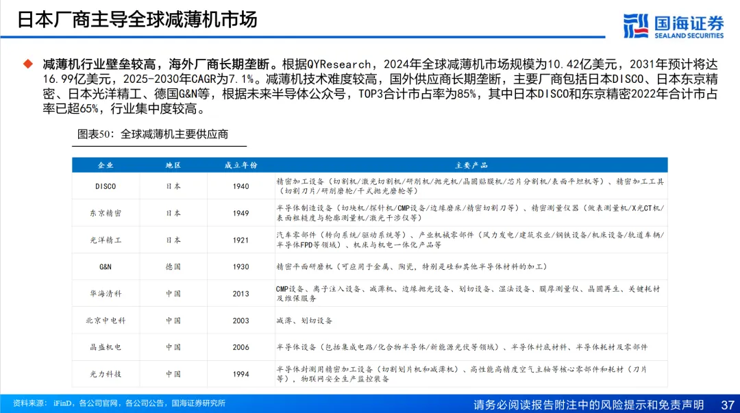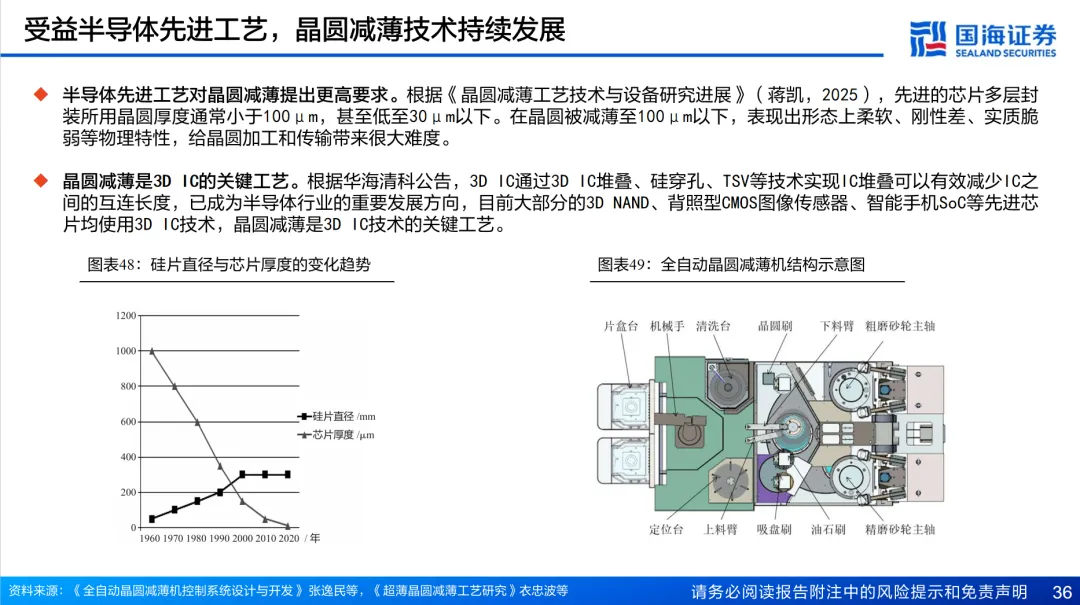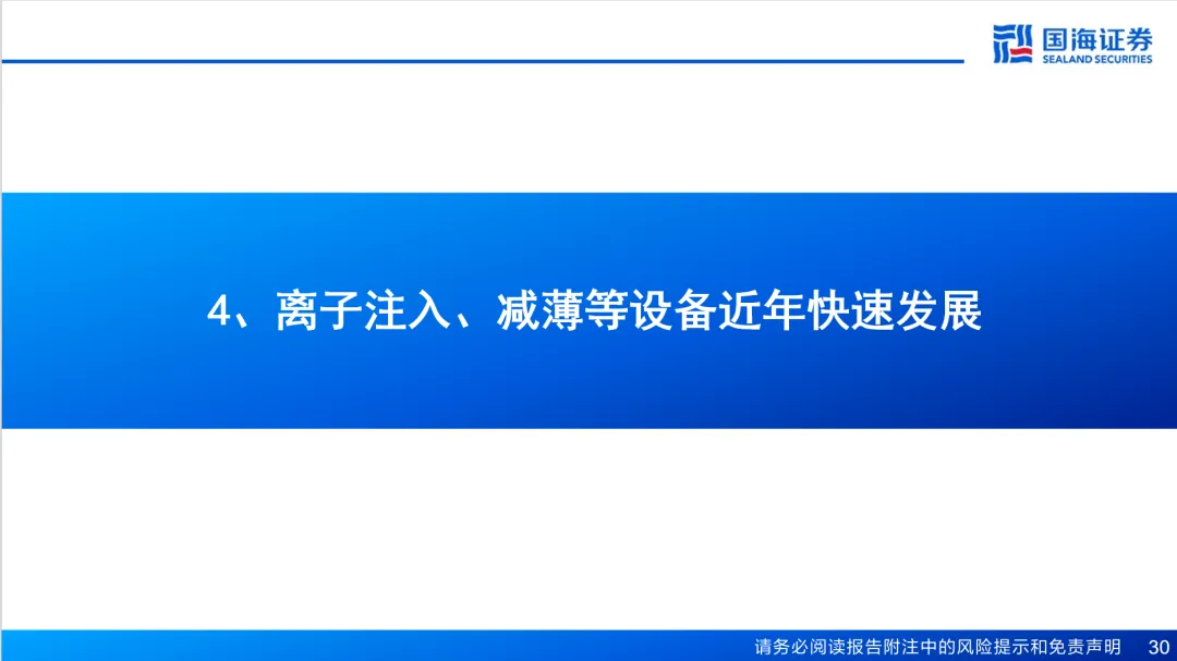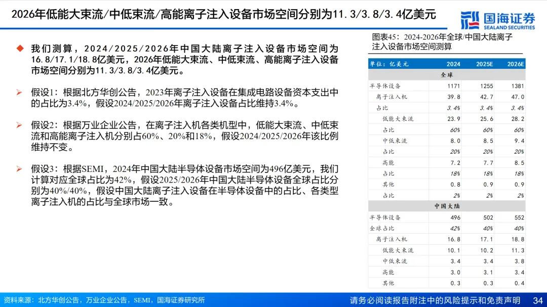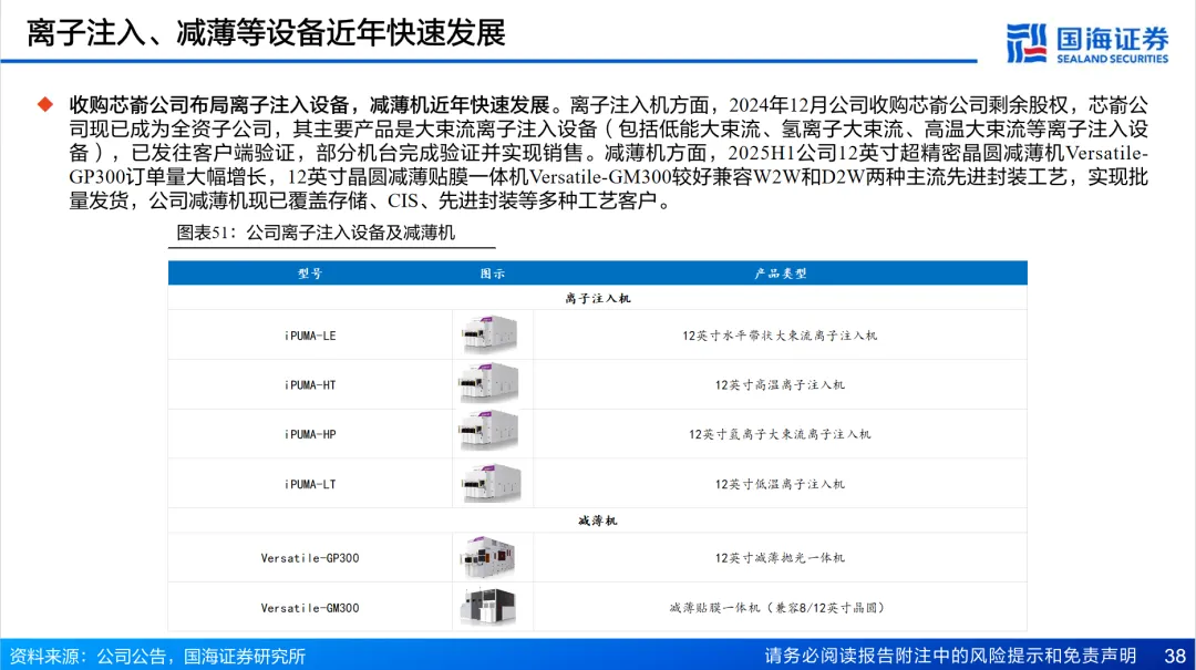 离子注入、减薄等设备新品快速发展。离子注入机行业集中度高,美国是中国设备主要进口来源。我们测算,2024年-2026年中国大陆离子注入设备市场空间为16.8/17.1/18.8亿美元,2026E低能大束流/中低束流/高能离子注入设备市场空间分别为11.3/3.8/3.4亿美元。晶圆减薄是3D IC的关键工艺,减薄机技术难度较高,日本厂商主导全球市场。公司近年持续完善设备品类,收购芯嵛公司布局离子注入设备,减薄机快速发展,“装备+服务”平台化布局加速。