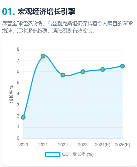 根据世界银行发布的最新经济展望,2025年乌兹别克斯坦的实际GDP增长率预计将达到6.2%,这一增速在中亚乃至更为广泛的新兴市场国家中均位居前列。经济增长的驱动力正从单一的资源出口转向更为健康的“消费-投资”双轮驱动模式: