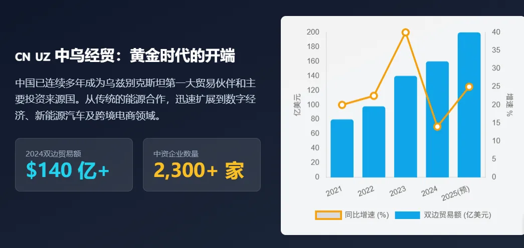2025年,中乌关系处于历史最好时期。在两国元首确立的“新时代全天候全面战略伙伴关系”指引下,中国稳居乌兹别克斯坦最大贸易伙伴和主要投资来源国的地位。投资结构正发生深刻变化,从传统的资源开采和工程承包,向产业链深度融合、绿色发展和数字经济全方位拓展。