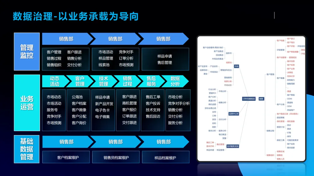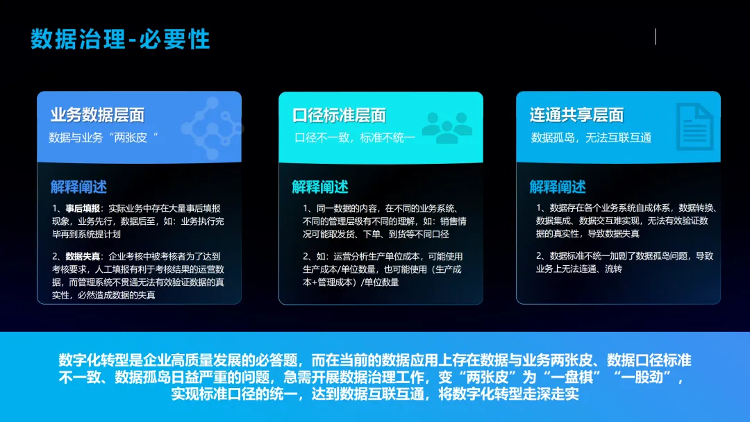 然而,公司在数据治理前面临诸多痛点:业务先行导致数据滞后,不同管理层级对数据口径理解不一;各业务系统自成体系,形成数据孤岛,数据转换、集成与交互困难,数据真实性难以验证。为此,公司确立了 “以客户为中心、以业务承载为导向” 的治理理念,构建了完善的数据治理体系。