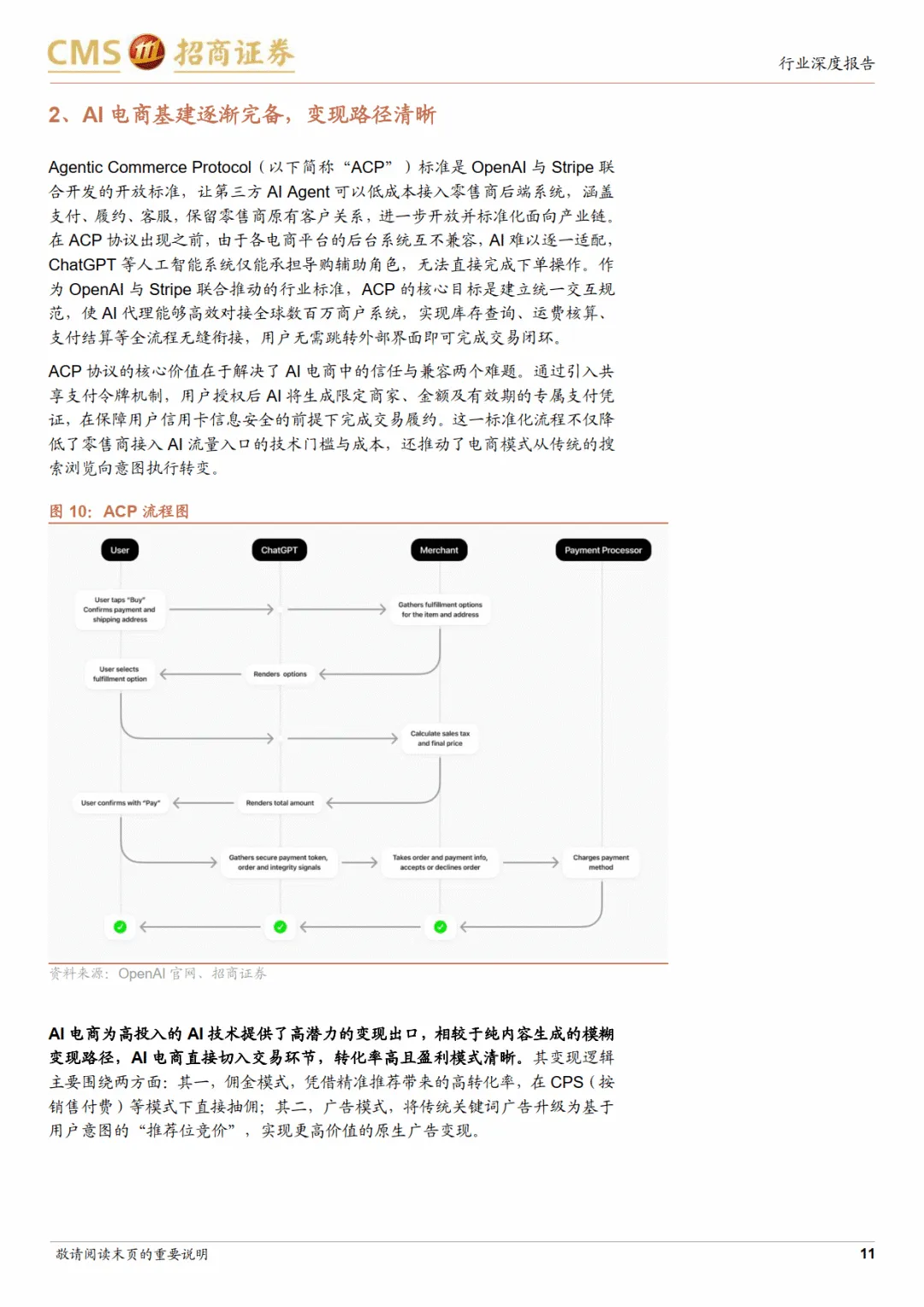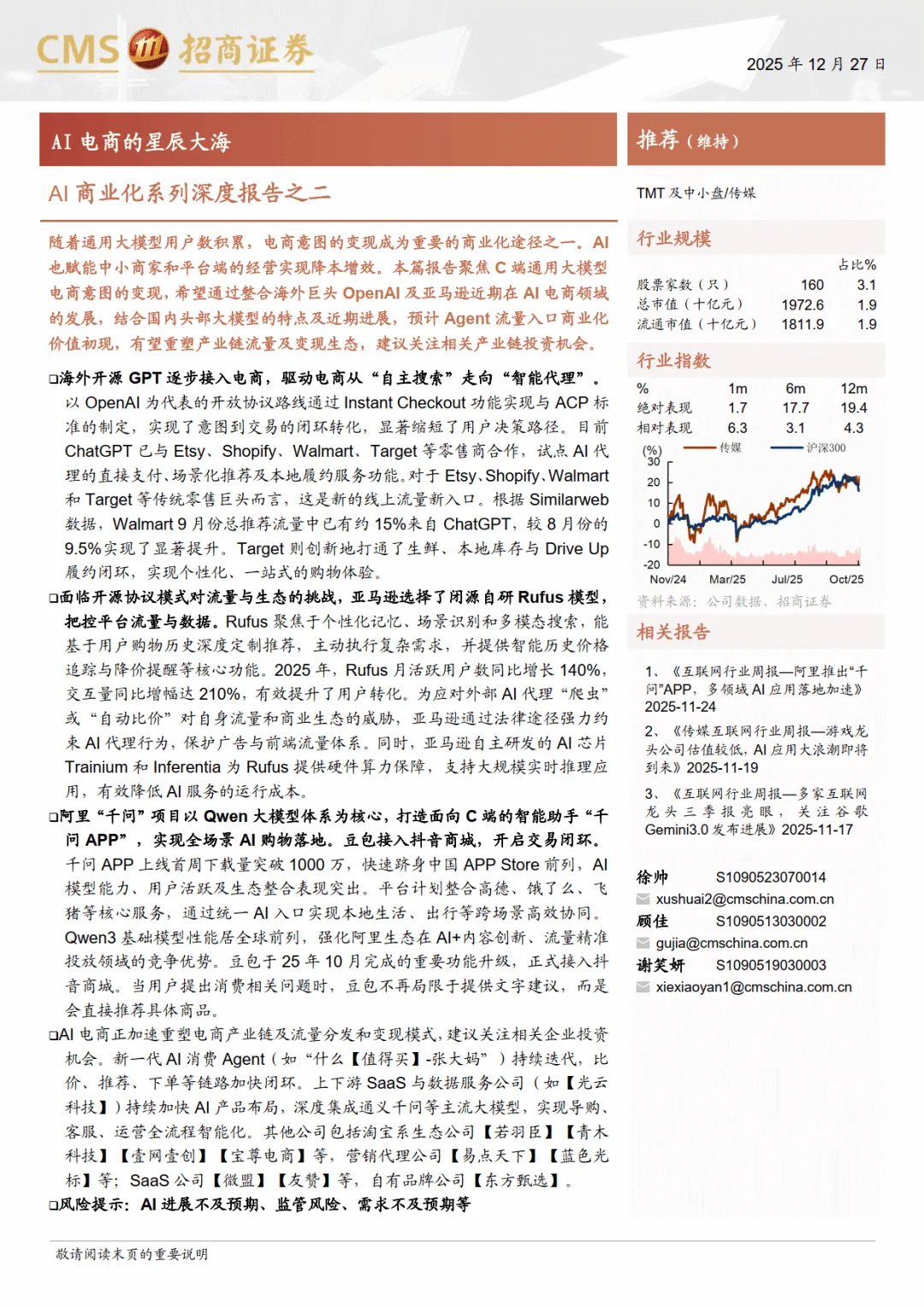 AI 电商重构行业生态,变现路径清晰。技术层面,ACP 协议建立统一标准,解决 AI 与商户系统的兼容问题,实现库存、支付、履约全流程衔接。模式层面,流量入口从传统货架转向 AI 代理,意图广告替代关键词广告,形成 “数据 - 模型 - 交易” 的强化闭环。盈利方面,主要通过交易佣金和意图竞价广告实现变现,精准推荐提升转化效率。产业链受益企业涵盖多类主体:平台型企业阿里、字节凭借流量与生态优势领跑;垂直应用端 “什么值得买” 推出 AI 购物管家 “张大妈”;SaaS 服务商光云科技、青木科技深度集成大模型,实现导购、客服等全流程智能化;此外还有淘宝系生态公司、营销代理及自有品牌企业等。