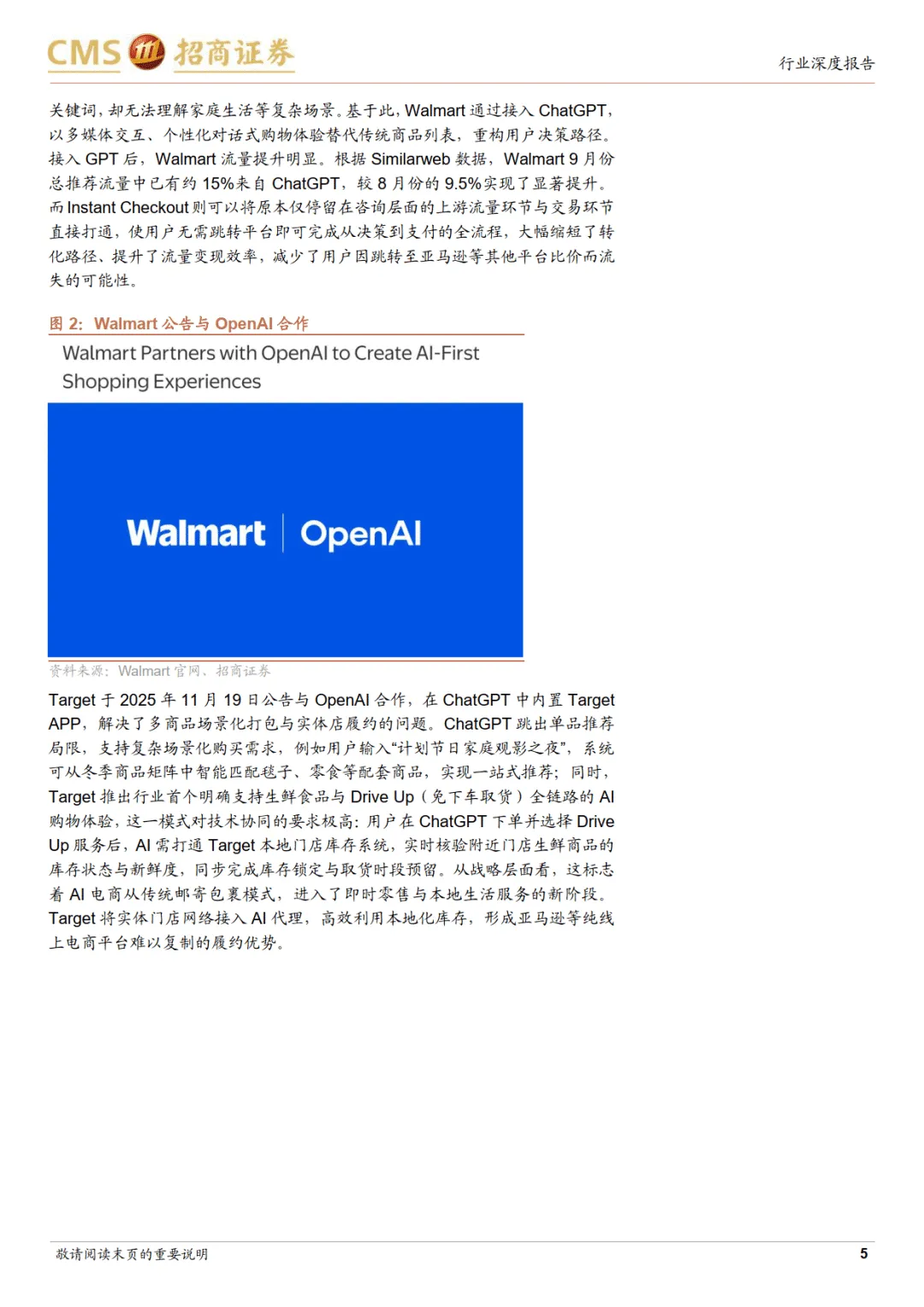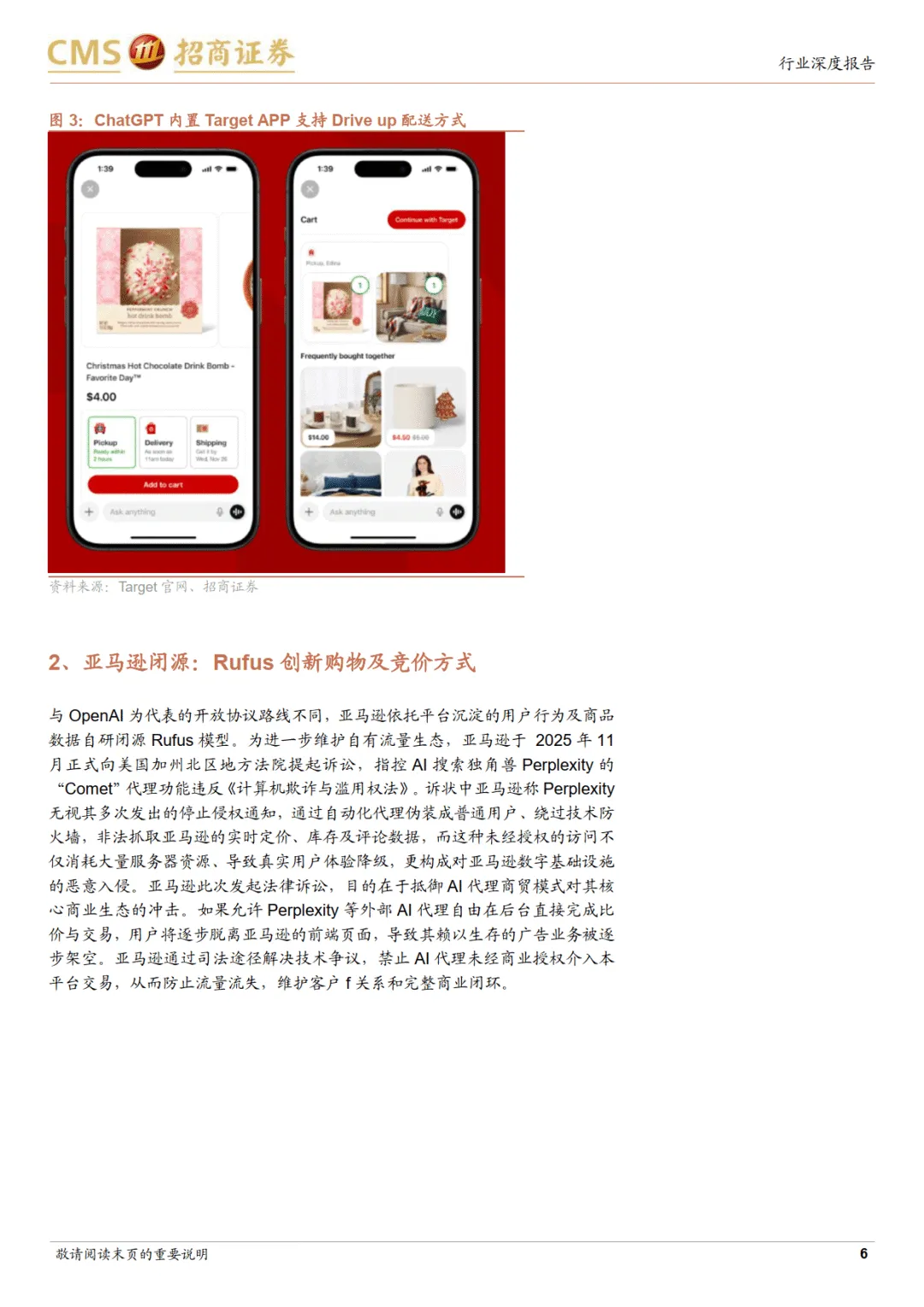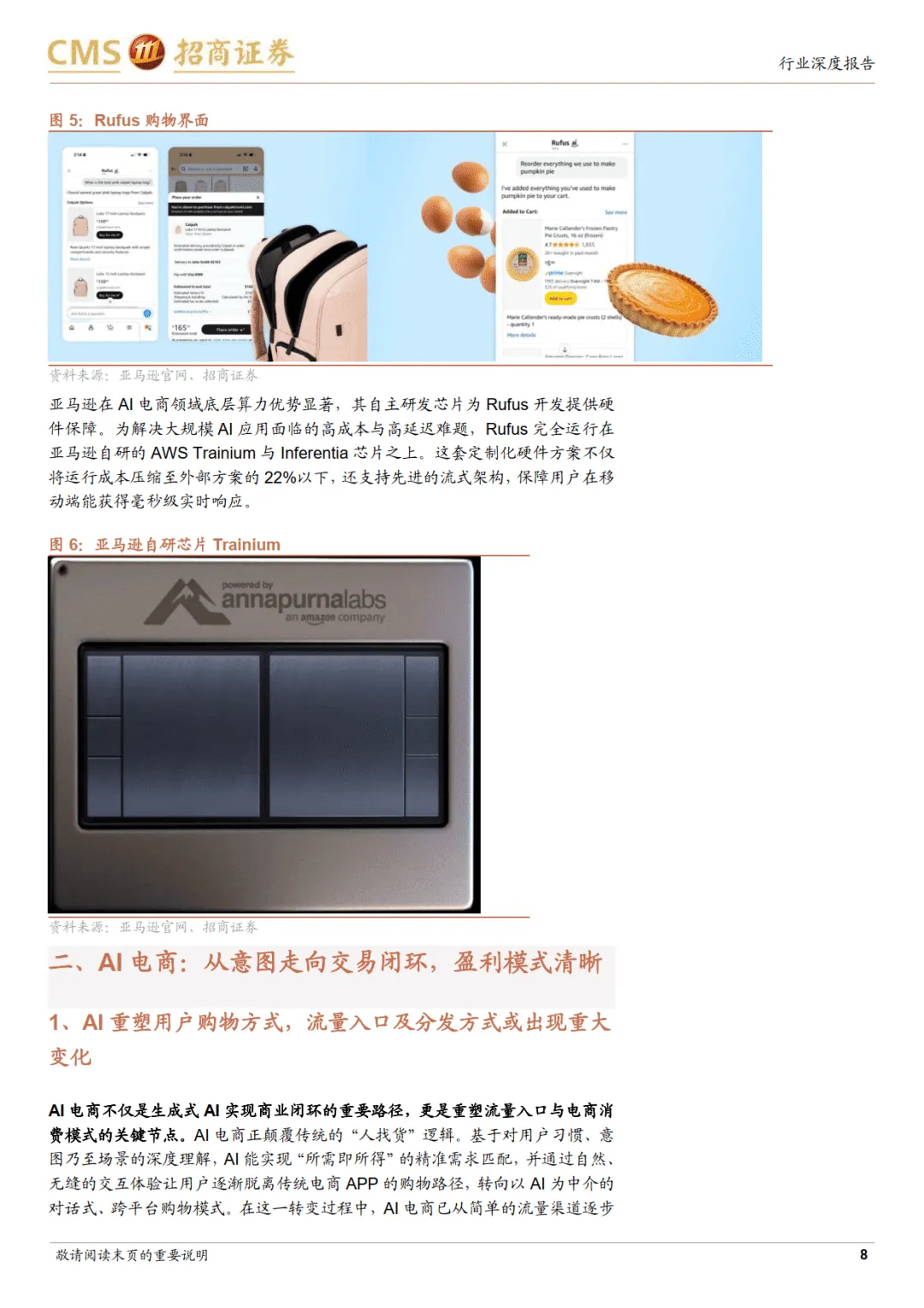 海外市场呈现两大路线竞争。开源路线以 OpenAI 为代表,通过 Instant Checkout 功能实现交易闭环,与 Etsy、Shopify、Walmart、Target 等零售商合作,支持对话框内直接支付、场景化推荐及本地履约服务。Walmart 9 月来自 ChatGPT 的推荐流量占比达 15%,Target 创新打通生鲜与免下车取货服务,标志 AI 电商进入即时零售新阶段。闭源路线以亚马逊为核心,自研 Rufus 模型,具备个性化记忆、多模态搜索及价格追踪功能,2025 年月活用户同比增长 140%,转化效率提升 60%。亚马逊通过法律手段保护流量生态,并依托自研 Trainium 和 Inferentia 芯片提供算力支撑,降低运行成本。