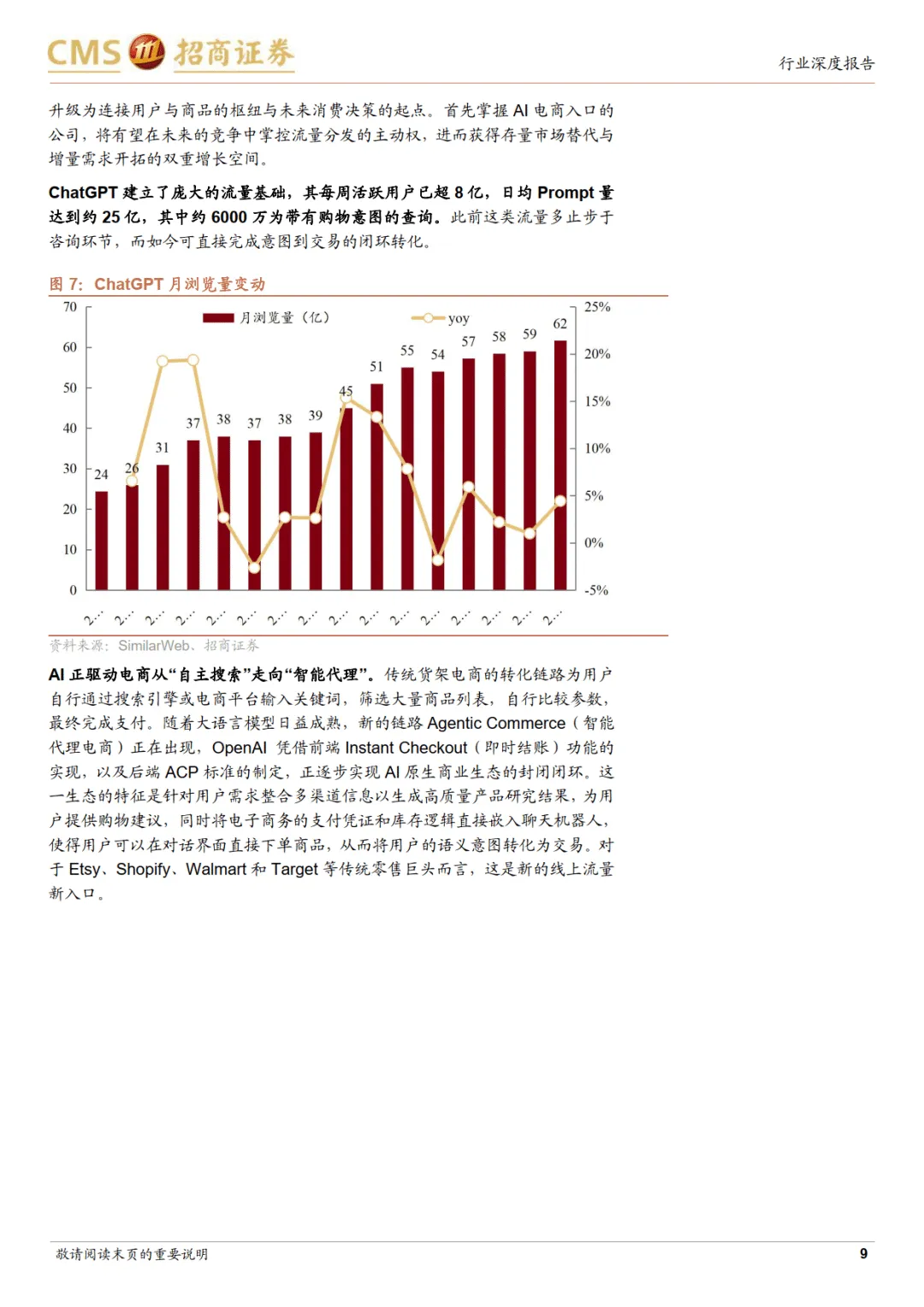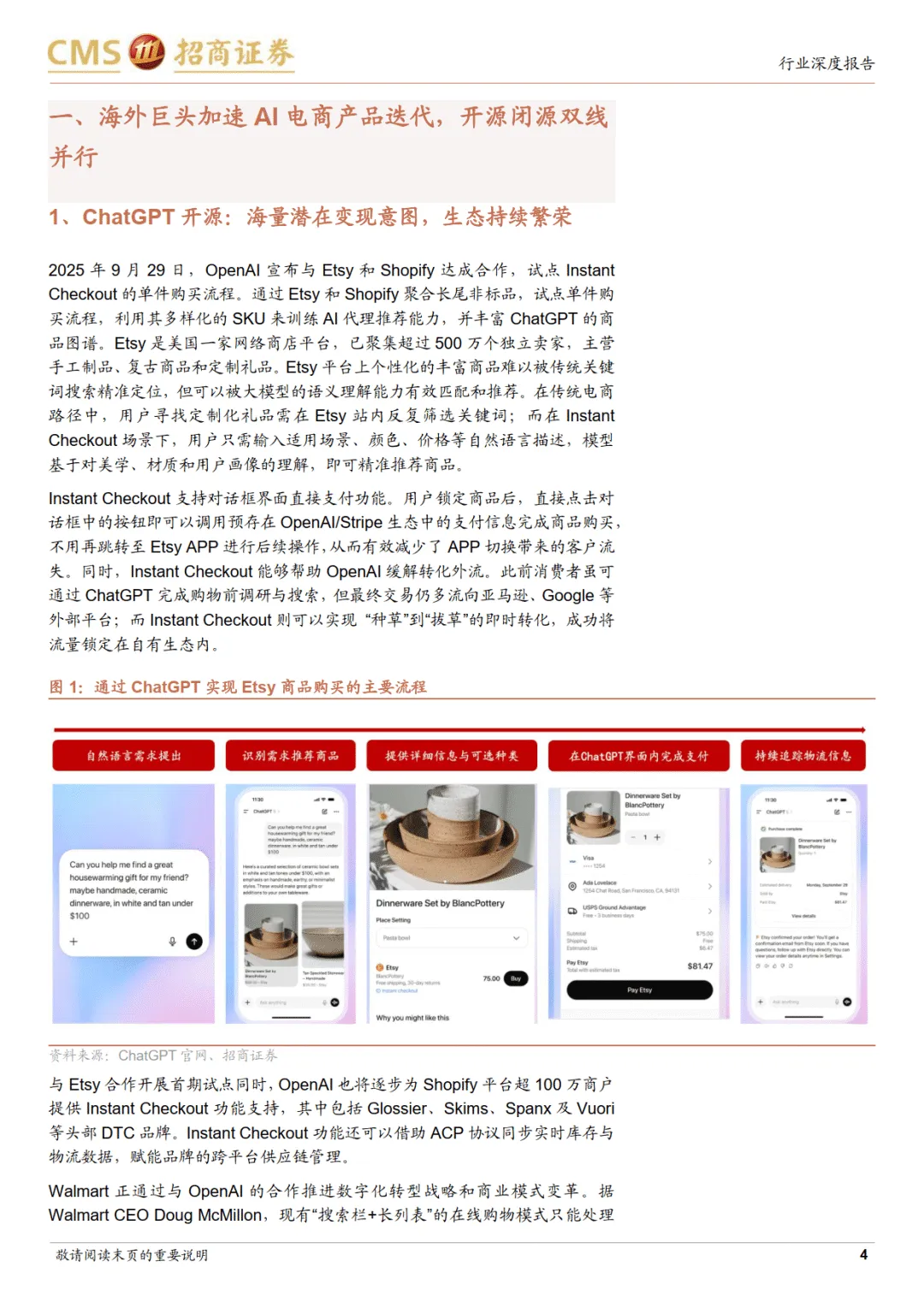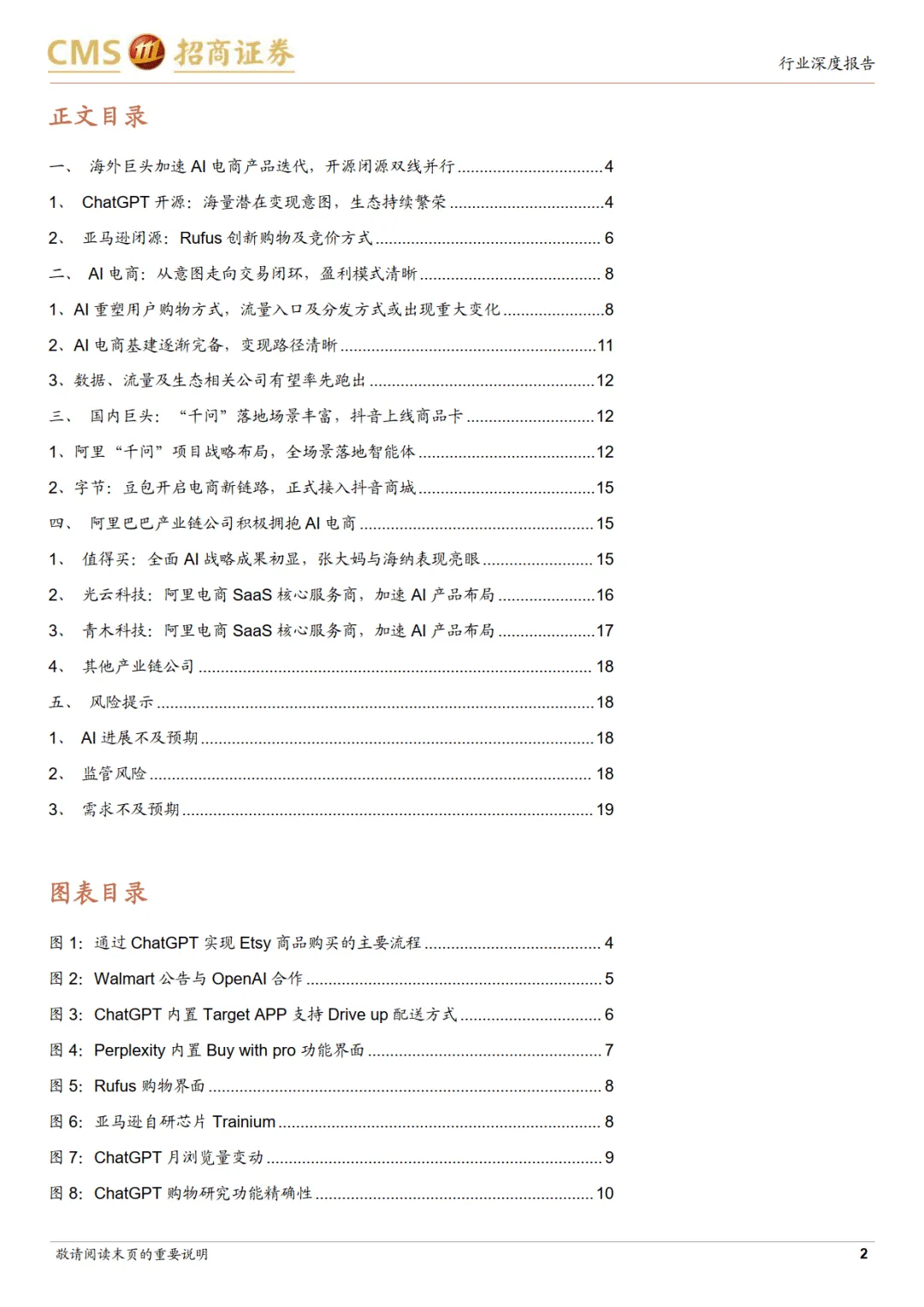 海外市场呈现两大路线竞争。开源路线以 OpenAI 为代表,通过 Instant Checkout 功能实现交易闭环,与 Etsy、Shopify、Walmart、Target 等零售商合作,支持对话框内直接支付、场景化推荐及本地履约服务。Walmart 9 月来自 ChatGPT 的推荐流量占比达 15%,Target 创新打通生鲜与免下车取货服务,标志 AI 电商进入即时零售新阶段。闭源路线以亚马逊为核心,自研 Rufus 模型,具备个性化记忆、多模态搜索及价格追踪功能,2025 年月活用户同比增长 140%,转化效率提升 60%。亚马逊通过法律手段保护流量生态,并依托自研 Trainium 和 Inferentia 芯片提供算力支撑,降低运行成本。