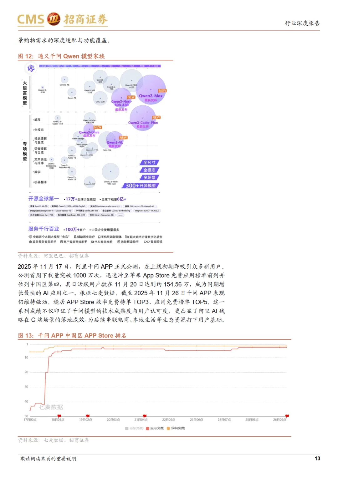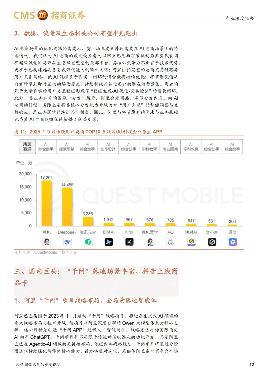 国内头部企业加速布局,场景落地持续深化。阿里 “千问” 项目以 Qwen 大模型为核心,推出千问 APP,上线首周下载量破千万,计划整合高德、饿了么、飞猪等生态资源,实现跨场景智能协同,Qwen3 模型性能跻身全球前列。字节豆包于 2025 年 10 月接入抖音商城,覆盖母婴、美妆等多品类,用户可通过自然语言指令获取商品推荐并跳转购买,同时整合本地生活与团购服务,完善消费链路。