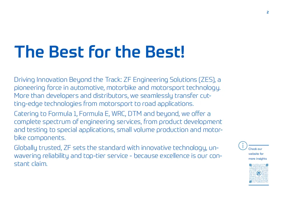 :ZF 在多个赛车系列中取得胜利,如 Formula 1、Formula E 和 WRC。例如,2023年 ABT Motorsport 在 Formula E 中获得首个 Gen3 杆位。 - 技术创新
