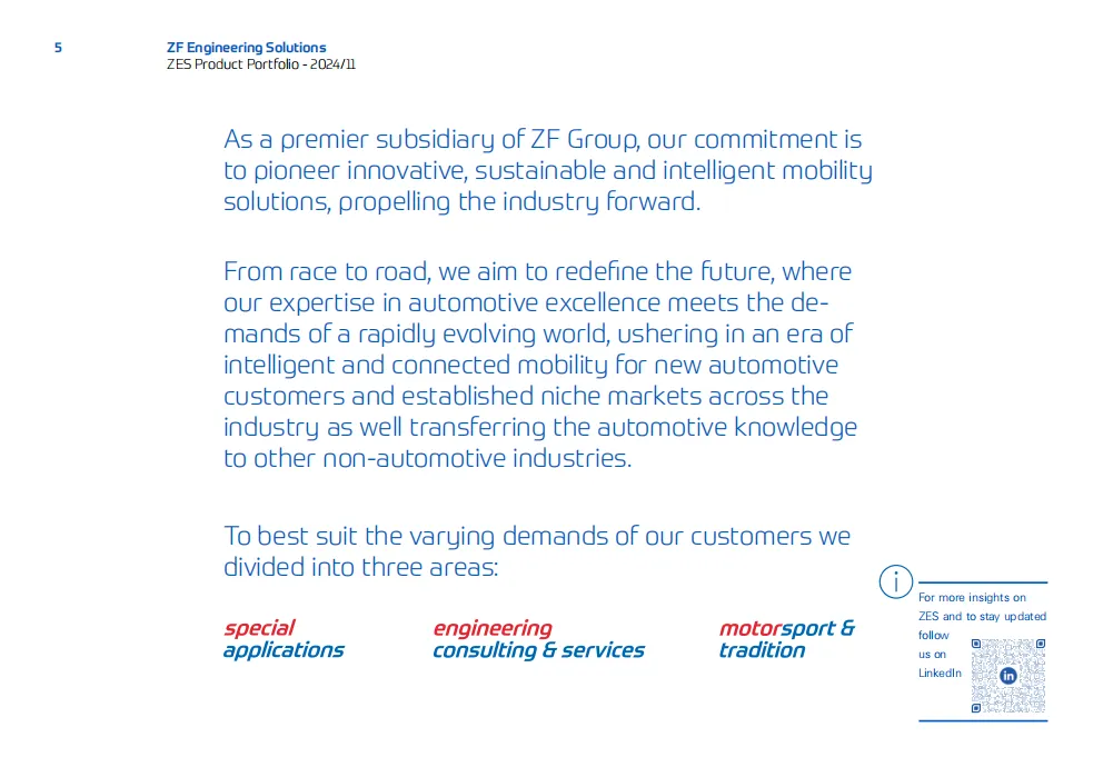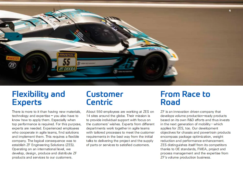 :ZF 的特殊应用部门为客户提供定制化解决方案。例如,SACHS Performance 产品是高性能汽车驾驶员的首选,提供卓越的耐用性和驾驶体验。