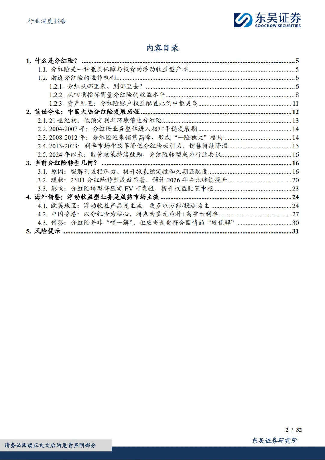 行业同时面临长端利率趋势性下行、权益市场波动、新单保费承压等风险。总体而言,在监管引导与市场需求双重驱动下,分红险已成为寿险行业低利率环境下的重要转型方向,其占比提升将重塑行业负债结构,推动行业向高质量发展转型,同时为保险资金权益投资带来长期增量空间。