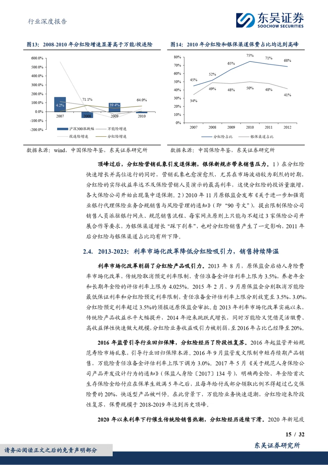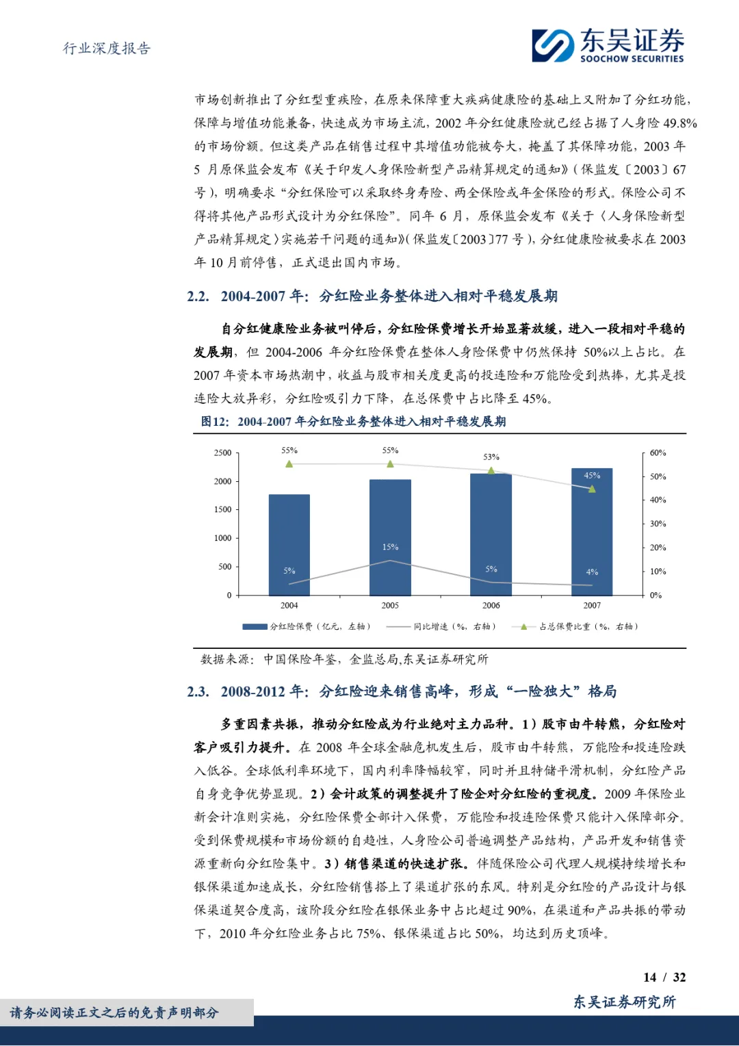 中国大陆分红险发展历经多轮起伏:21 世纪初因人身险预定利率下调应运而生;2008-2012 年受益于金融危机后股市熊市、新会计准则调整及银保渠道扩张,占行业保费比重达 75% 的 “一险独大” 格局;2013-2023 年受利率市场化改革影响,传统险、万能险相继崛起,分红险吸引力下降,保费连续四年下滑;2024 年以来,在国内利率下行、利差损压力加大背景下,监管政策持续鼓励浮动收益型产品,分红险转型成为行业共识。