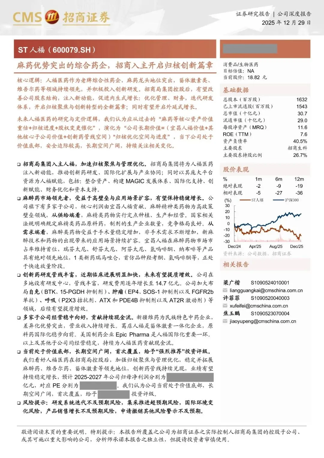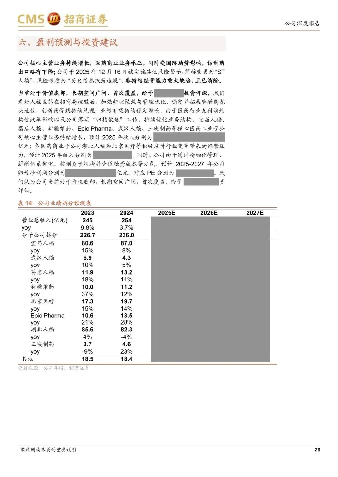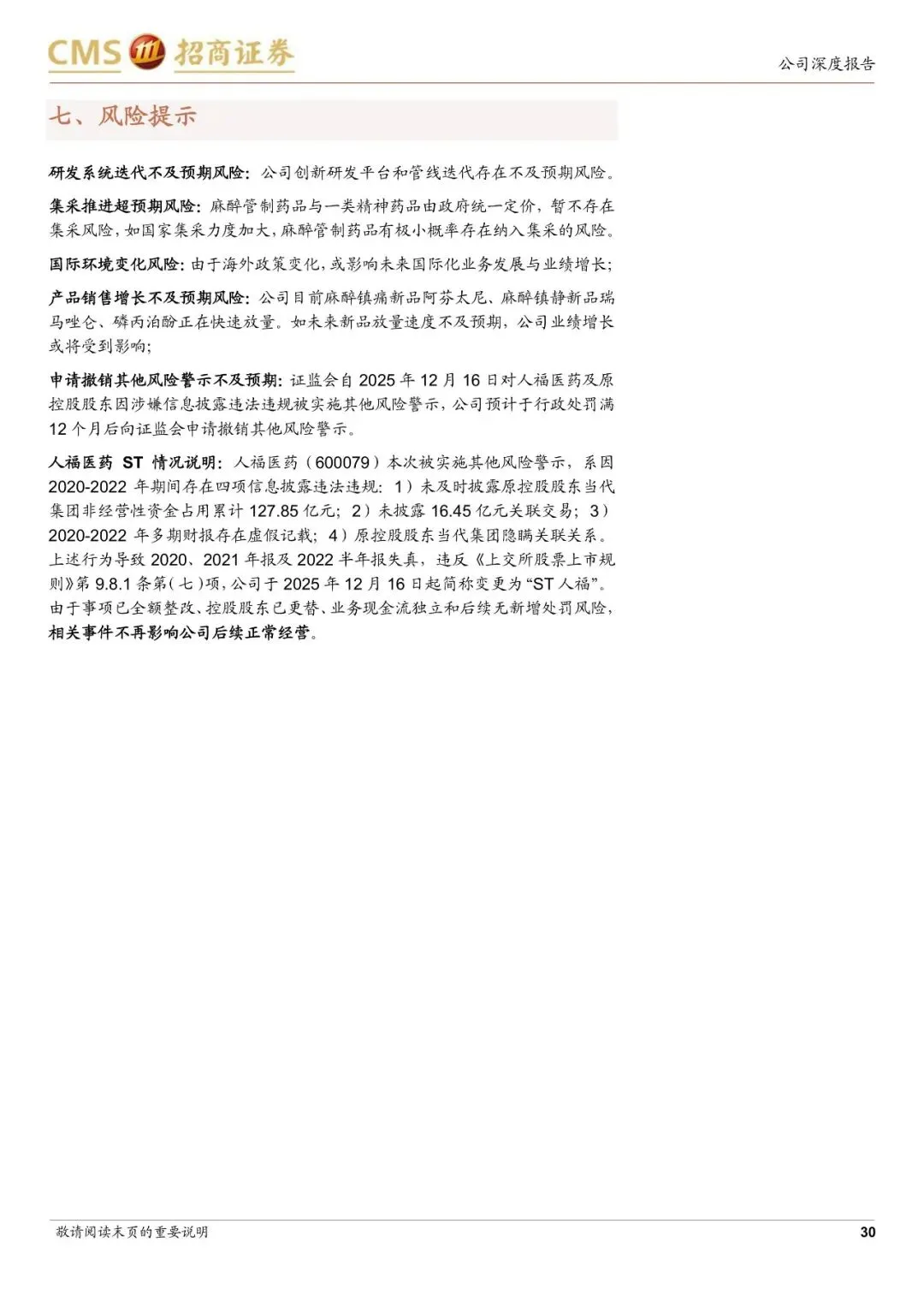 盈利预测与投资建议。我们看好人福医药在招商局控股后,加强归核聚焦与管理优化,稳定并拓展麻醉药、维吾尔药、甾体激素等领先地位,创新药管线持续兑现,业绩有望持续稳定增长。