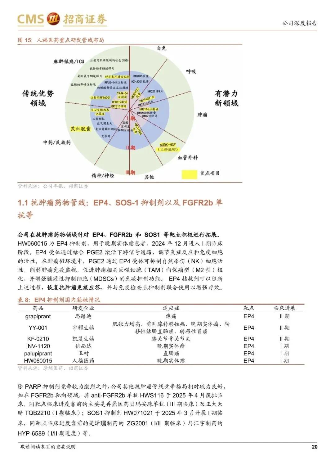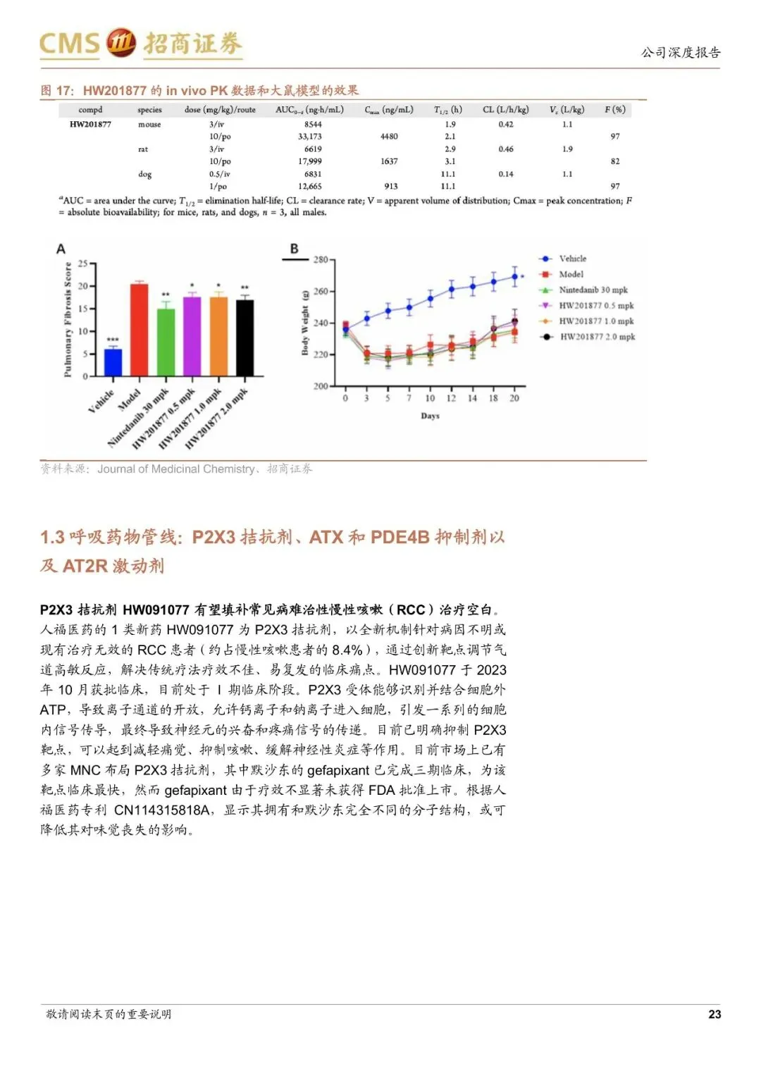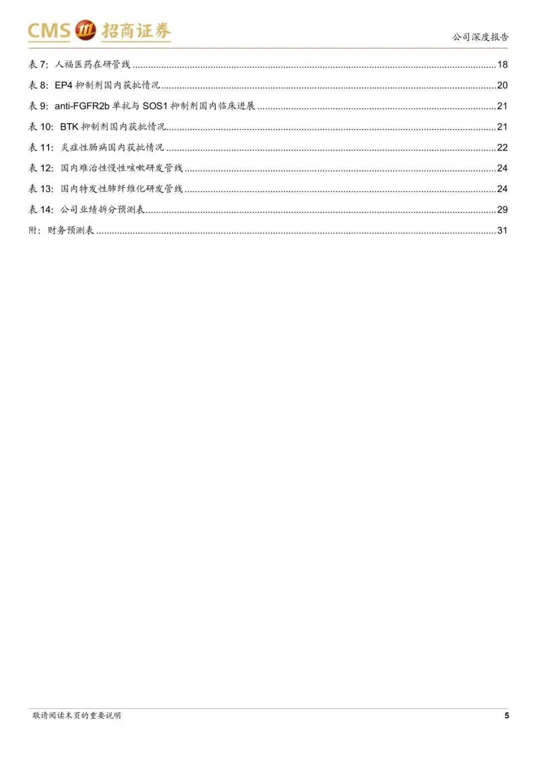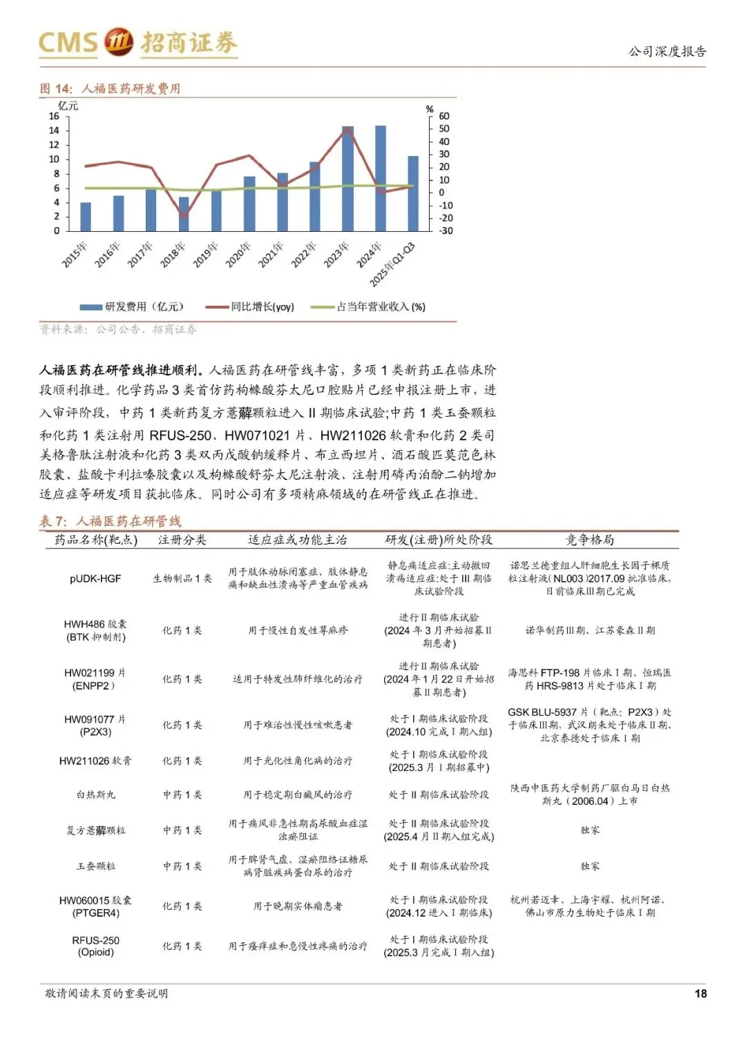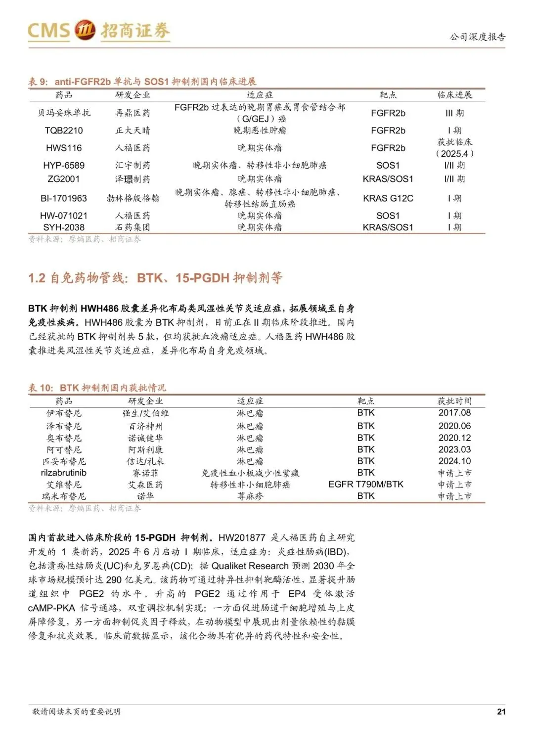 创新药研发管线丰富,近期临床进展明显加快,未来有望提质增效。公司在多地设有研发中心,管线丰富,研发费用逐年增长至 14.7 亿元。公司加大布局自免(BTK、15-PGDH 抑制剂)、肿瘤(EP4、SOS-1 抑制剂以及 FGFR2b单抗)、呼吸(P2X3 拮抗剂、ATX 和 PDE4B 抑制剂以及 AT2R 激动剂)等领域,后续有望提质增效。