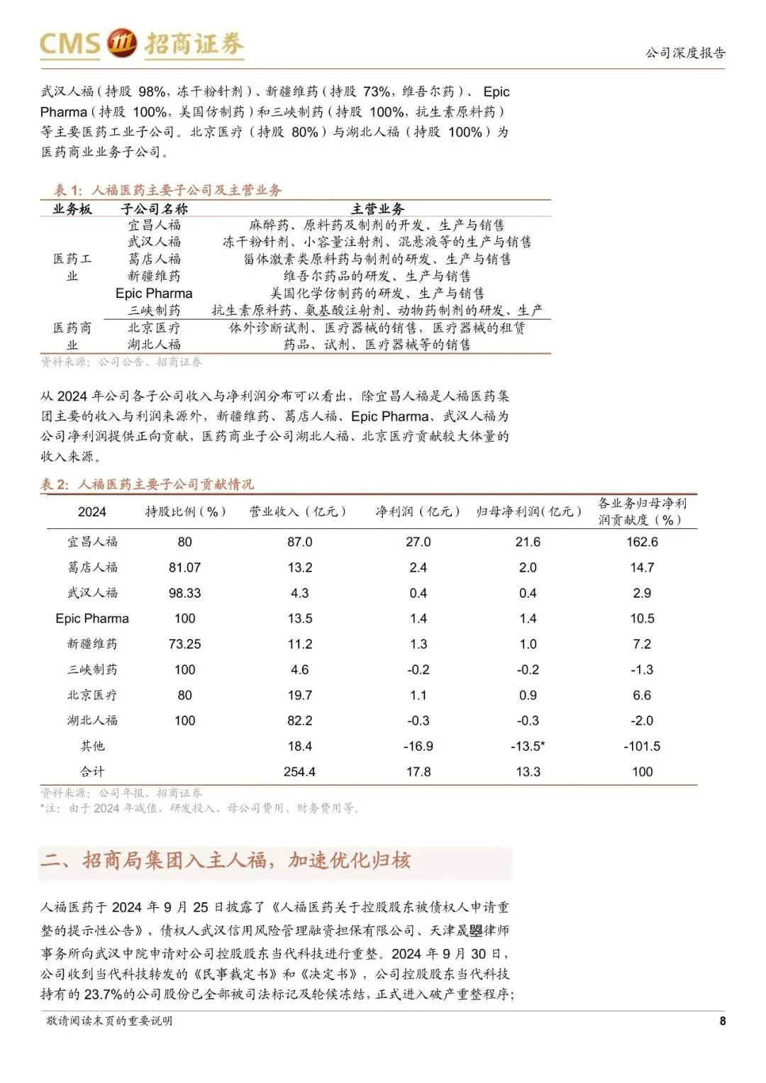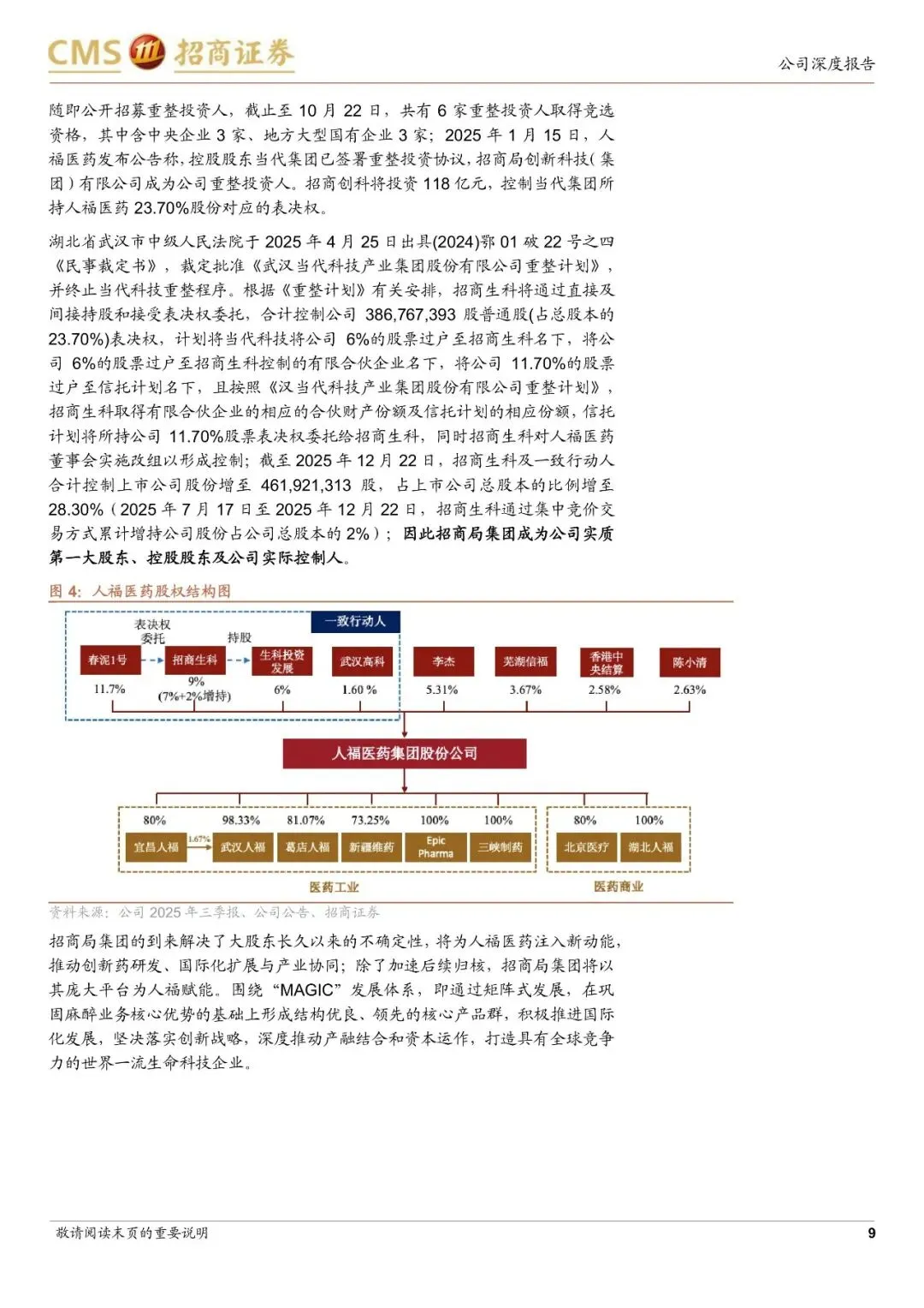 招商局集团入主人福,加速归核聚焦与管理优化。招商局集团将为人福医药注入新动能,推动创新药研发、国际化扩展与产业协同;同时以其庞大平台资源为人福赋能,包括:整合资产、构建 MAGIC 发展体系、国际化支持、创新赋能、财务优化和资本支持。