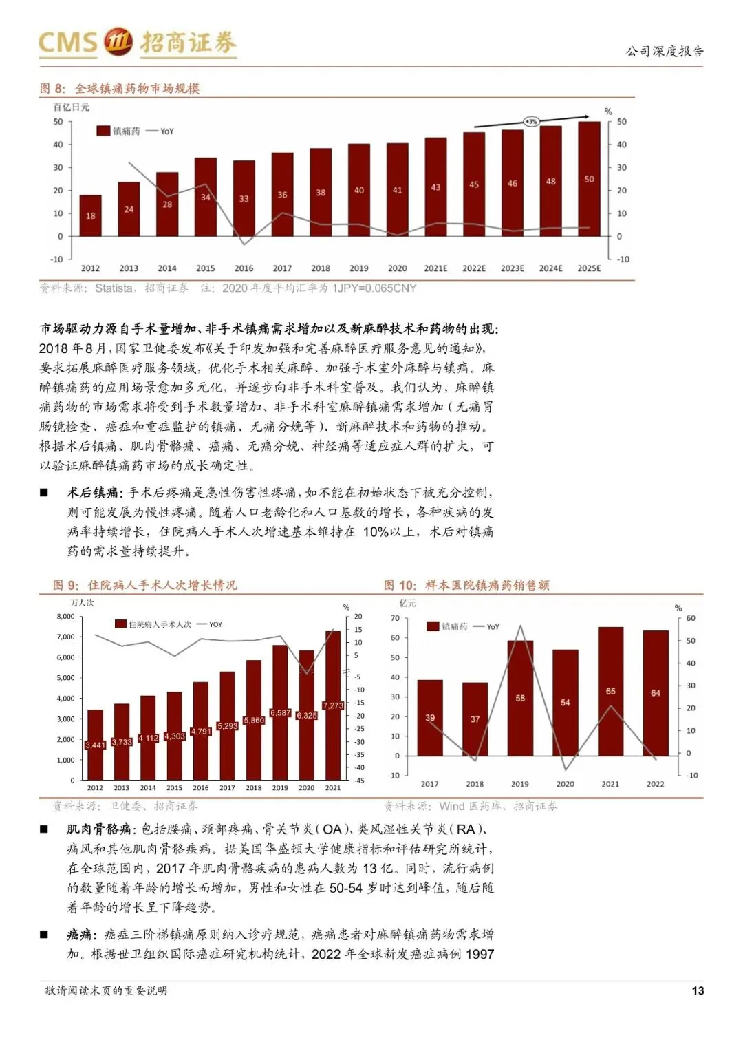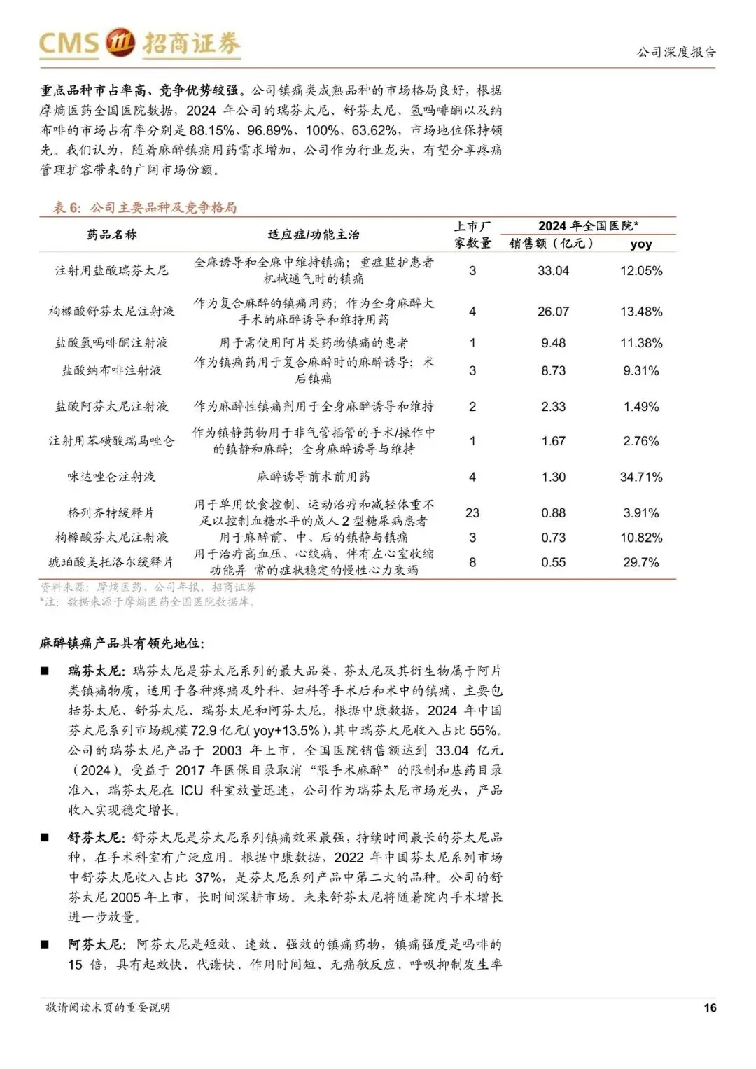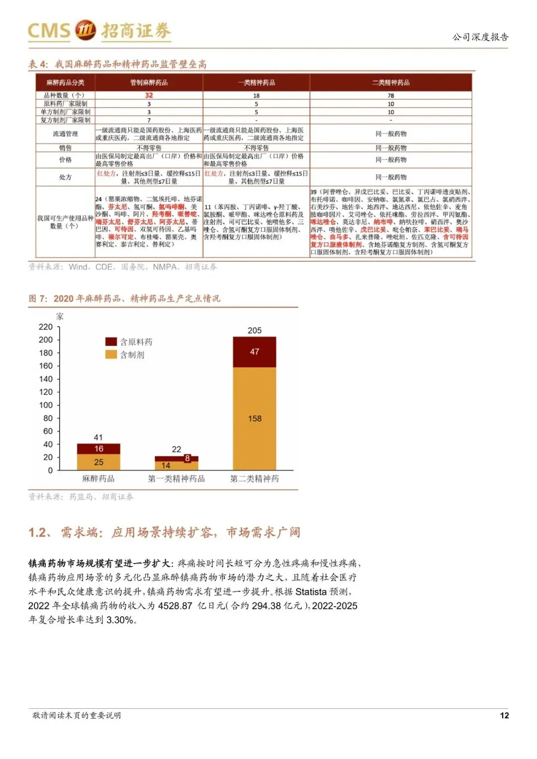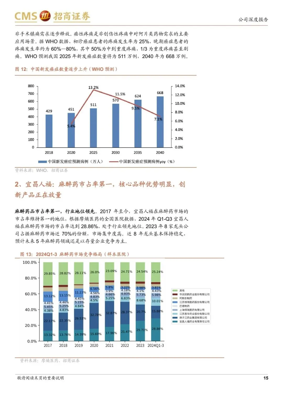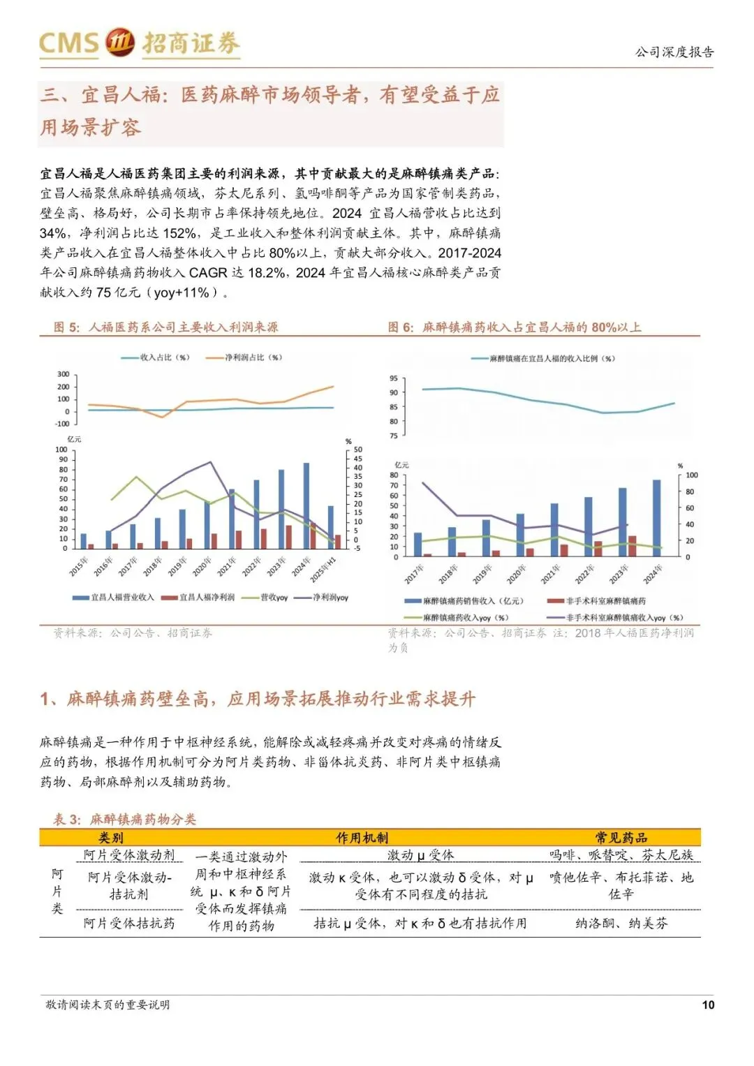 麻醉药市场领先者,受益于高壁垒与应用场景扩容,有望保持稳健增长。公司旗下有多家子公司,核心利润由宜昌人福贡献。麻醉精神类药物为高政策壁垒领域,从供给端看,麻精类药物实行定点种植、生产和经营。国家相关法规明确规定麻精类药品原料药,制剂的生产企业数量,竞争格局良好。从需求端看,麻醉类药物受益于手术量稳定增加,非手术需求不断增加,新麻醉技术和药物的出现带来的应用场景持续扩容。宜昌人福在麻醉药物市场市占率维持首位,瑞芬太尼、舒芬太尼、阿芬太尼、氢吗啡酮、纳布啡等产品具有绝对领先地位,1 类新药瑞马唑仑,首仿品种羟考酮、氢吗啡酮等,正处于快速放量阶段。