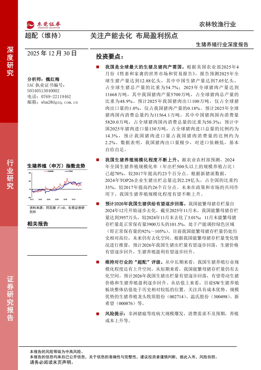 - 维持生猪养殖行业“超配”评级,当前SW生猪养殖板块估值处于历史相对低位。