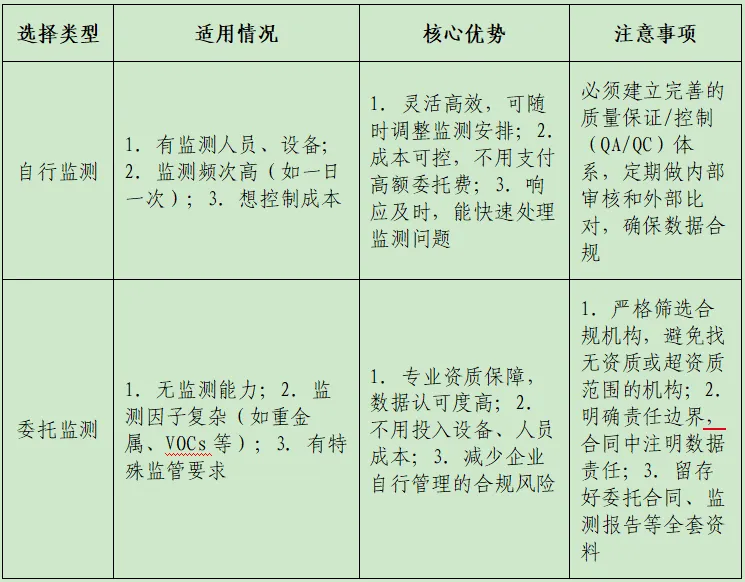很多企业纠结“选自行还是委托”,结合一日一次的高频监测需求,整理了选择建议表,对照看更清晰: