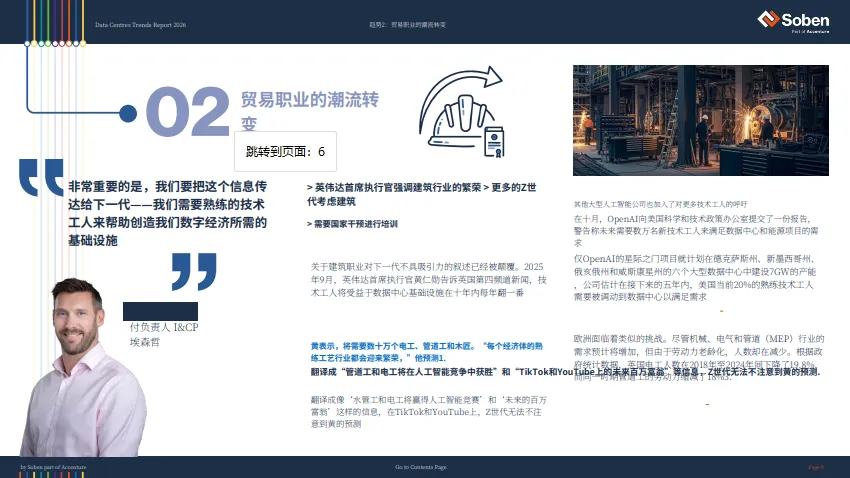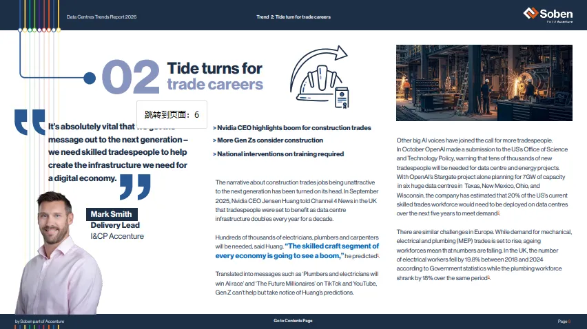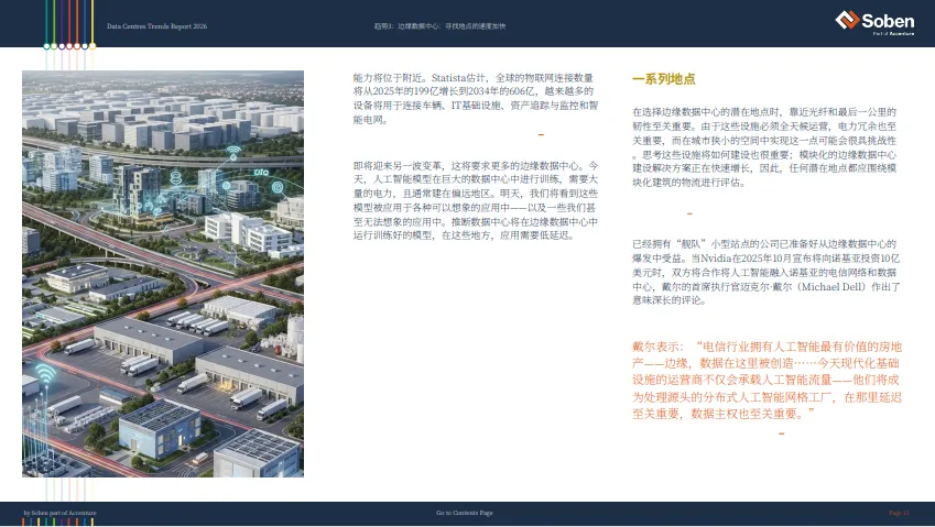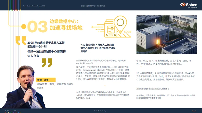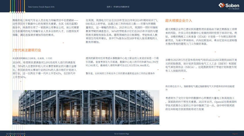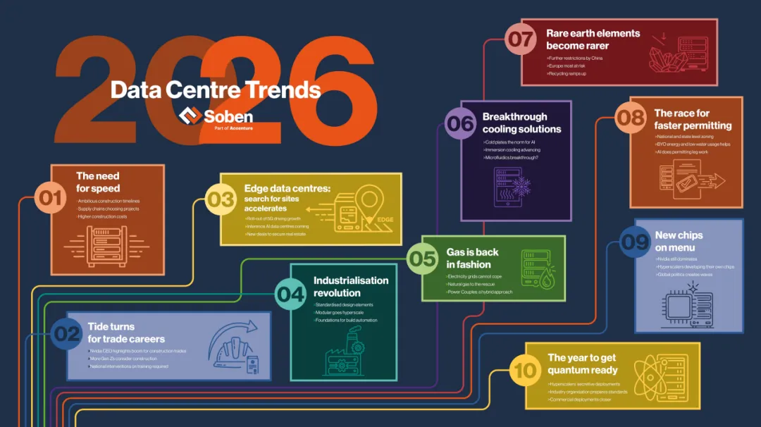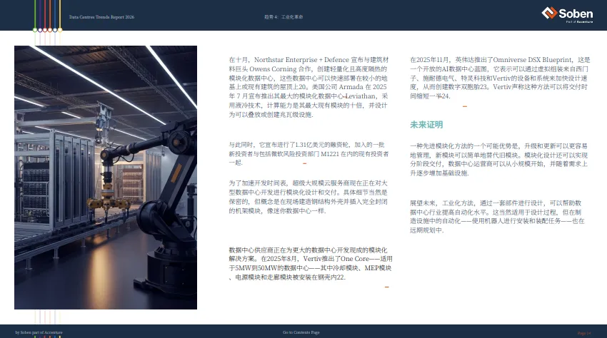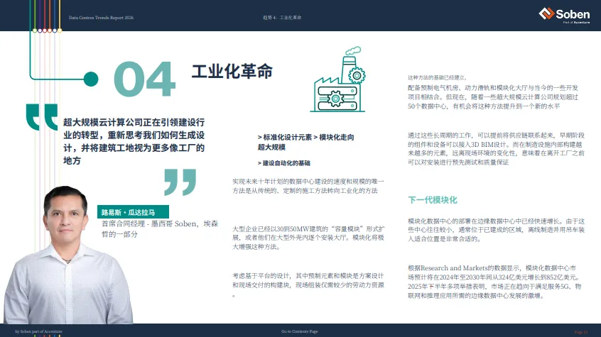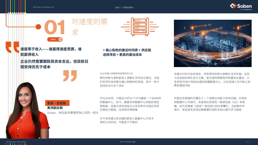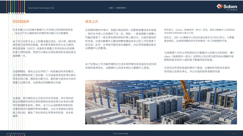 2025年12月,Soben(埃森哲旗下)发布了《2026年数据中心行业趋势报告:全面提速》,报告剖析了在人工智能(AI)需求激增的背景下,全球数据中心行业为应对增长与效率挑战而“全面提速”的核心动向。