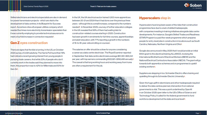 建筑技工职业对下一代吸引力不足的叙事已被扭转。英伟达CEO黄仁勋预测,未来十年数据中心基础设施每年翻番,将需要数十万名电工、管道工和木匠。OpenAI也警告,美国需要数万名新技工来支持数据中心和能源项目。Gen Z(Z世代)对从事技工职业的兴趣显著增长,但国家层面的培训干预至关重要。