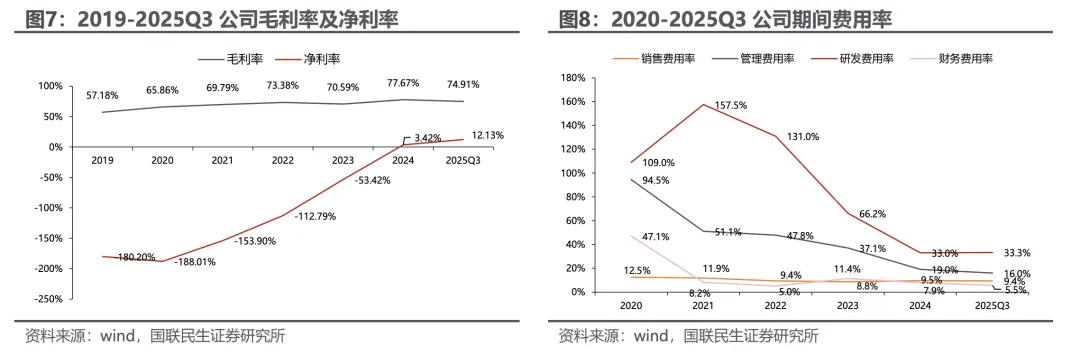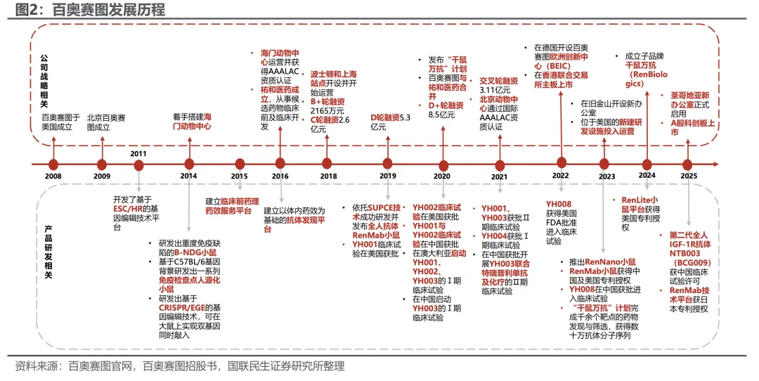 百奥赛图以创新基因编辑技术驱动新药研发,可提供“基因编辑+创新动物模型+临床前CRO服务+抗体分子转让/授权”全链条服务。百奥赛图成立于2009年,于2022年9月在中国香港上市,公司依托基因编辑技术平台,不断延伸业务领域,逐渐形成了“基因编辑—创新动物模型—临床前CRO服务”和“基因编辑—RenMice等技术平台—抗体分子转让/授权”两条业务线。基石业务创新模式动物销售及临床前CRO服务维持高速增长,“千鼠万抗”对外转让/授权通过首付款+里程碑付款+销售分成方式确保长期收益弹性,打开未来成长天花板。公司已建立优秀客户群,海内外兼修,且出海势头强劲。公司已完成5300+项定制化动物模型,拥有4390+种现货型动物及细胞模型,完成6350+项药物评估项目,已开展280余项全人抗体合作项目,50余项RenMice授权项目,抗体库拥有约100万条全人抗体序列。基于领先的底层基因编辑技术、高人源化且丰富的创新动物模型及抗体平台,公司已与海内外众多知名药企建立稳定合作,涵盖全球前十大制药企业。25H1海外收入占比68%,2020-2024年海外收入CAGR为64.52%,海外市场一路高歌,前景可期。公司成立初期,主要从事定制化基因编辑服务,此后以技术创新驱动,逐步向下游拓展至创新动物模型销售、临床前CRO服务、抗体分子转让/授权等,发展历程可归纳为以下四个阶段:2009-2015年:依托基因编辑技术,临床前产品及服务业务初步搭建完成。百奥赛图成立之初提供定制化基因编辑服务,2011年成功开发基于ESC/HR技术的小鼠基因编辑技术平台。2014年基于CRISPR/EGE基因编辑技术,开发出一系列免疫检查点及其它创新靶点的人源化小鼠,并开始将高质量的自主研发动物模型出售给国内外药企。2015年,公司将业务延伸至临床前药理药效评价服务领域。2016-2019年:创新动物模型销售及临床前CRO服务快速发展,全人抗体小鼠RenMab平台研发成功。2016年,海门动物中心运营,从事抗体药物开发的祐和医药成立。依托SUPCE技术于2019成功发布全人抗体小鼠平台RenMab。2020-2023年:“千鼠万抗”大规模研发投入期,临床前产品及服务稳健增长。2020年3月,公司启动“千鼠万抗”计划,针对千余个创新药物靶点,形成了百万级抗体序列库,并陆续开发了RenLite、RenNano、RenTCR、RenTCR-mimic等小鼠系列。研发费用由2019年的1.59亿元迅速增加至2022年的6.99亿元。同期,模式动物、临床前CRO及抗体开发业务增长迅猛,公司营收复合年均增速40%+。2023Q3“千鼠万抗”实现阶段性成果,大规模研发投入进入尾声。 2024-至今:加速商业化,扭亏为盈,模式动物和抗体授权双引擎驱动业绩高增。2024年起扭亏为盈,2025H1营收同比高增51.27%,海外占比约2/3,净利润增长近200%。2025年圣地亚哥新办公室正式启用,全球化布局加速。预计创新动物模型及临床前CRO基本盘稳增长,抗体分子库有望保障长期收益弹性。股权结构清晰,子公司分工明确。沈月雷博士、倪健博士为公司创始人,二人系夫妻关系,二人与百奥常青、百奥常盛、祐和常青、祐和常盛四个员工持股平台系一致行动人,合计持有公司24.01%的股份。公司拥有9家控股子公司,以及4家参股公司。子公司江苏百奥负责基因编辑小鼠模型出售及临床前药理药效评价服务,祐和医药聚焦肿瘤和非肿瘤的抗体药物的开发,枫叶宠物是为抗体药物研发设立的大动物临床医学转化中心,旗下子公司分工明确、协同布局,共同推进公司全球业务的高效运营。核心管理团队稳定且经验丰富。公司创始人沈月雷为马萨诸塞大学免疫学博士毕业,深耕模式动物行业十余载,具备深厚的专业背景与产业资源。公司核心团队成员多具备丰富的行业经验,且在公司任职多年,引领公司持续稳健发展。1.2 海外业务加速扩张,研发成果落地促进盈利性提升多因素驱动收入端连年高增,大规模研发投入成果落地,利润端扭亏为盈并持续向好。收入端:受抗体药市场快速增长、公司强大的研发能力、丰富且优质的动物模型资源(人源化小鼠具备显著优势)、多样化的抗体库(百万级抗体序列库)、高服务水平、高市场认可度(客户覆盖全球前十大药企)等因素驱动,公司营业收入由2019年的1.70亿元增长至2024年的9.80亿元(CAGR达41.96%)。2025年前三季度营收9.41亿元,同比高增59.50%。利润端:2024年以前处于亏损状态,主要系抗体开发和新药研发费用投入大,且尚未产生足够收入。随着公司调整业务布局,新药开发以合作为主而不再自行承担药物临床阶段的研发费用;“千鼠万抗”项目成果逐渐落地,促进抗体开发业务营收快速增长。目前大规模研发投入已结束,商业化加速下利润端将持续向好。毛利率稳步提升,大规模研发投入阶段结束+规模效应驱动期间费用率下降,净利率快速改善。2019-2022年公司毛利率由57.18%提升至73.38%,主要系临床前药理药效评价业务和模式动物销售业务毛利率不断提升,以及高毛利率的抗体开发业务收入占比提高所致。2023年毛利率有所下滑主要系临床前药理药效评价业务人力成本提升,以及单位小鼠成本有所增加所致。2024年受益于抗体开发以及模式动物销售业务毛利率提升,公司毛利率进一步提升至77.67%。净利率主要受研发费用率影响较大,2020-2022年,在研发团队规模扩大、“千鼠万抗”计划逐步展开、在研管线不断推进等因素影响下,研发费用率维持较高水平。2023年开始,随着大规模研发环节结束,研发费用率逐