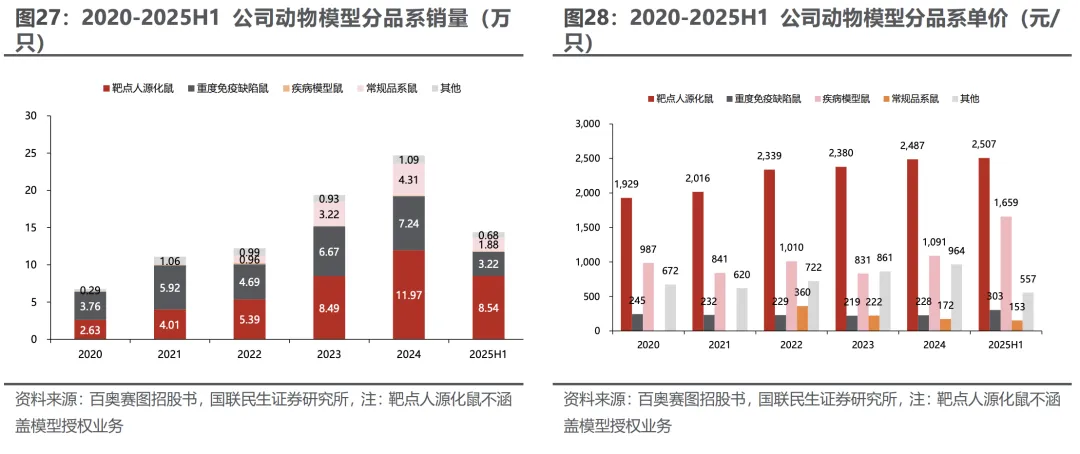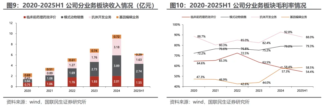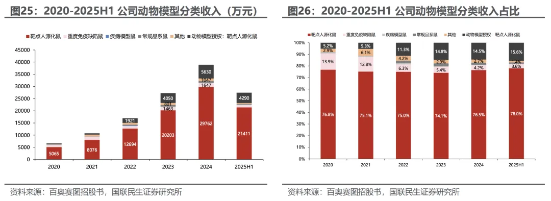 模式动物销售:公司为创新药企、CRO企业、高校、研究机构以及医院提供各类创新小鼠模型,其中高价值的靶点人源化小鼠占主导。2020-2024年,模式动物收入由0.66亿元增至3.89亿元(CAGR为55.86%),收入占比由26.24%提升至39.71%,2025H1达2.74亿元,同比增长56.13%。