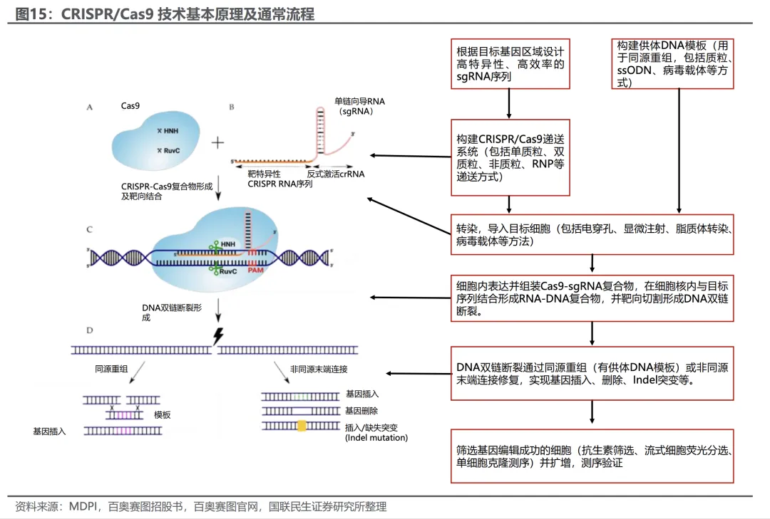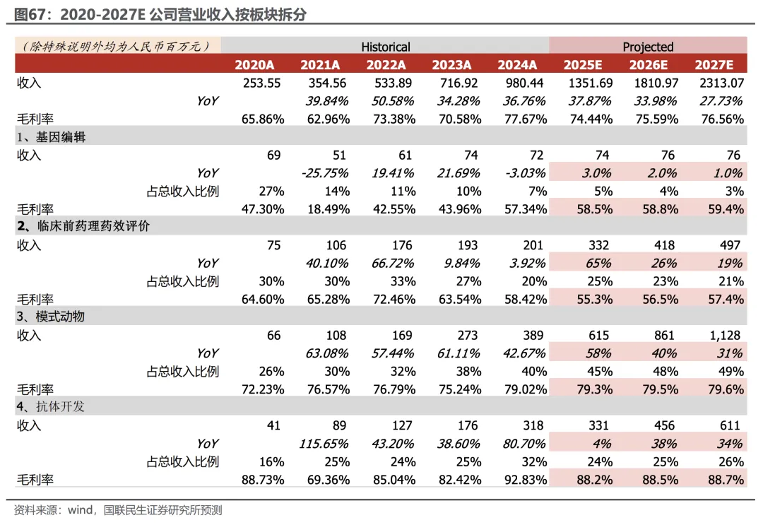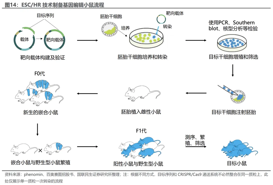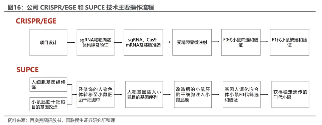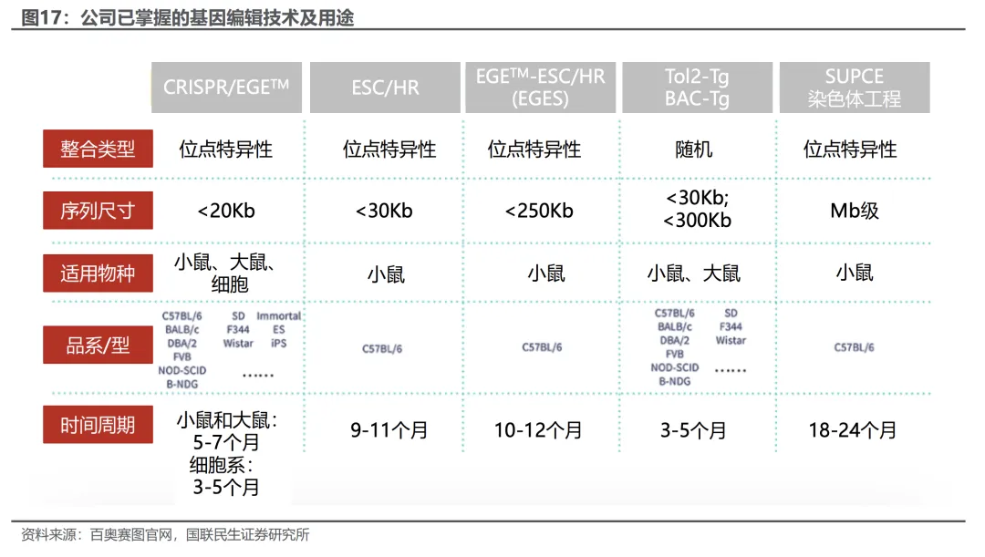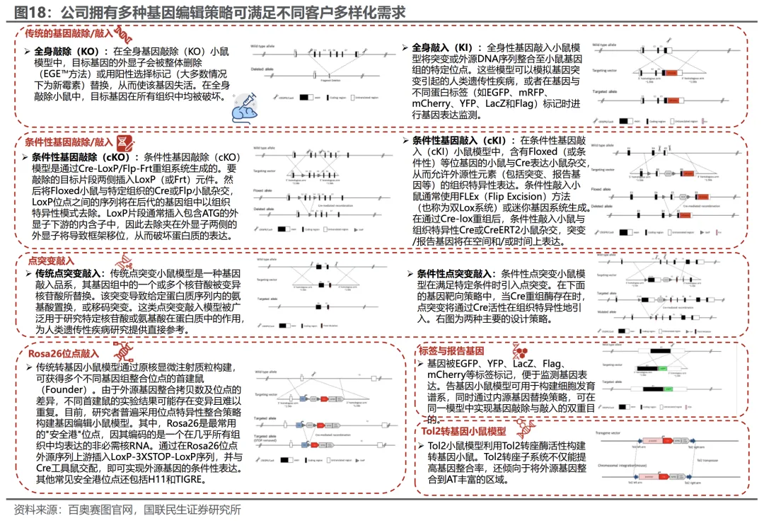 海外市场增长势能强劲,收入占比高达68%。依托于美国子公司的成熟运营,公司2020-2024年海外收入由0.91亿元增至6.66亿元(CAGR为64.52%),海外收入占比由36.19%提升至67.97%。公司境外业务维持高增的原因主要系:1)动物模型资源竞争力强,模型种类丰富、动物质量高、交付时间短;2)临床前药理药效评价项目经验丰富且项目管理能力优秀;3)丰富的“抗体序列货架”可满足海内外客户的核心需求,显著节省研发时间并降低了早期研发的不确定性。海外布局早,已建立良好名声和稳定合作网络。2. 临床前研究服务:依托领先的基因编辑技术与丰富的小鼠品系,动物销售与CRO业务协同共进基因编辑下游应用空间广阔,在医学领域具备独特价值,未来前景可期。基因编辑是一种对生物体DNA片段进行特定修饰的技术,通常用于实现对特定DNA片段的插入、删除,特定碱基的缺失、替换等改造,基因编辑可以在生物体全身或特异组织的基因组中进行永久性改变。利用基因编辑技术得到的动物或细胞系等模型可模拟出人类特定生理、病理及细胞特征,对研究基因的功能,阐明生物体的遗传进化、疾病发生的分子机制,提供相关的疾病治疗药物评价等发挥了重要作用,是目前基因功能研究的重要技术手段之一。基因编辑技术在医学、农业、畜牧业等领域应用空间广阔,在技术的持续拓展及延伸下,基因编辑技术将带来巨大的社会价值与经济价值。十余年沉淀技术积累深厚,公司已熟练掌握多项关键基因编辑技术。经过十余年的技术积淀,公司已熟练掌握ESC/HR、CRISPR/EGE等关键技术、并自主开发了SUPCE技术,具备深厚的基因编辑技术实力,可高效满足各类基因编辑需求。ESC/HR技术:该技术利用同源重组(HR)原理,获得经过定向基因编辑的胚胎干细胞(ESC),通过ESC细胞全能性使其发育为嵌合体动物的生殖细胞,最终获得经过定向基因编辑的动物模型,被广泛用于各类小鼠模型的制备。国内对于该技术的应用起步较晚,百奥赛图创立初期,创始人沈月雷博士带领初创团队搭建了基于ESC/HR的小鼠基因编辑技术平台,并形成两项发明专利。该平台由重组载体构建、显微注射以及自主开发的C57BL/6背景的小鼠胚胎干细胞系等构成,该胚胎干细胞系经过70余次的传代后仍具有全能性,基因改造后能够获得稳定种系遗传的小鼠,对同一染色体的多轮基因改造具有重要意义。ESC/HR技术主要针对小鼠进行基因编辑,服务周期约7-11个月。CRISPR/EGE技术:该技术是百奥赛图在CRISPR/Cas9技术的基础上进行优化和改进,形成的具有自主知识产权的基因编辑技术,该技术将细胞内发生同源重组的概率提高了多个数量级,使得对哺乳动物的基因编辑可直接在受精卵中操作,可以实现对所有物种的基因改造。公司与ERS签署了专利许可协议,获得了全球范围内的非独占使用授权。百奥赛图在CRISPR/Cas9基础上开发了EGETM(Extreme Genome Editing)系统,通过位点特异性的基因编辑,比单独使用CRISPR/Cas9在插入大型DNA片段方面效率提高了近20倍,目前百奥赛图85%的小鼠和100%的大鼠基因编辑定制服务项目都是通过EGETM技术生成,服务周期约6-8个月。SUPCE技术:SUPCE (size-unlimited precise chromosome engineering)技术是一种在染色体水平上定点改造基因组DNA的遗传学操作技术,由公司自主开发所得,可突破其他基因编辑技术对基因长度的限制,进行百万碱基对(Mb)级别的改造。该技术整合了基于ESC胚胎干细胞的同源重组、Cre/LoxP介导的染色体截短或易位、微细胞介导的染色体转移、piggyBac转座子系统介导的抗性基因删除等方法,可进行Mb级大片段基因人源化小鼠的制备,具有高稳定性及可复制性。 SUPCE 技术可通过以下几个步骤实现基因替换:首先,将人源目的基因所在染色体定向改造为特定的人工染色体载体;其次,利用微细胞介导的染色体转移技术将该载体转移到经修饰的小鼠胚胎干细胞中;再次,利用Cre/LoxP 介导的染色体间双易位,获得Mb级DNA片段人源化胚胎干细胞;最后,通过囊胚注射获得嵌合小鼠,制备出相应的Mb级DNA片段人源化小鼠模型。公司利用该技术成功开发了全人抗体小鼠平台RenMice,并正在开发其它在药物研发领域有价值的超大基因簇人源化小鼠模型,如自然杀伤细胞基因簇(NKC)人源化小鼠等。以基因编辑技术为基石,公司开发多种基因编辑策略满足多样化客户需求。公司主要针对大/小鼠及细胞系提供多种类型的基因编辑服务,涵盖基因敲除、条件性敲除、基因敲进、条件性敲进、点突变、人源化、转基因等。此外,公司还提供少量基因编辑单项服务(质粒构建、检测等)和动物模型定制化扩繁服务。公司的基因编辑策略包括:基因敲除/条件性敲除:通过基因敲除或条件性敲除,在大/小鼠上实现全身或特定组织器官或细胞的基因缺失,用以研究目的基因在生物体内的生理功能。基因敲进/条件性敲进:通过全基因敲进或条件性敲进,在大/小鼠上实现全身或特定组织器官的基因表达,以用于多种研究目的。例如,通过敲进荧光蛋白标记基因监测和追踪目的基因的表达。点突变:将基因组中的一个或多个核苷酸进行特异性突变,导致编码的蛋白质序列的氨基酸变化或发生移码,常用于人类遗传疾病模型研究。人源化:实现人源基因与鼠源基因的替换,用以研究人类疾病发病机制以及检测药物的动物体内药效等。转基因:将外源DNA片段随机整合到大/小鼠基因组中,用以研究基