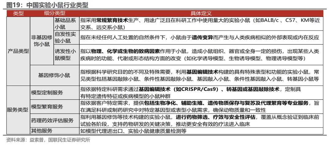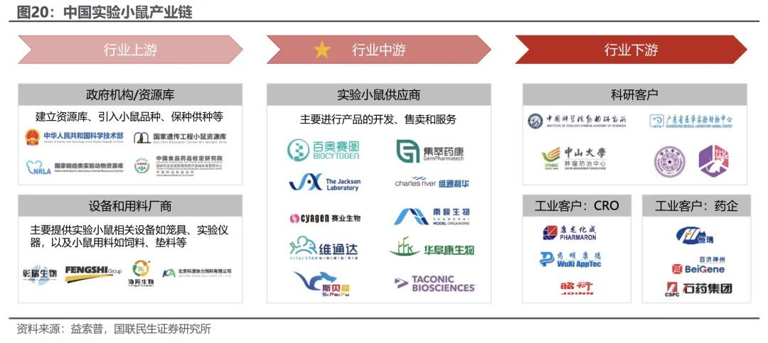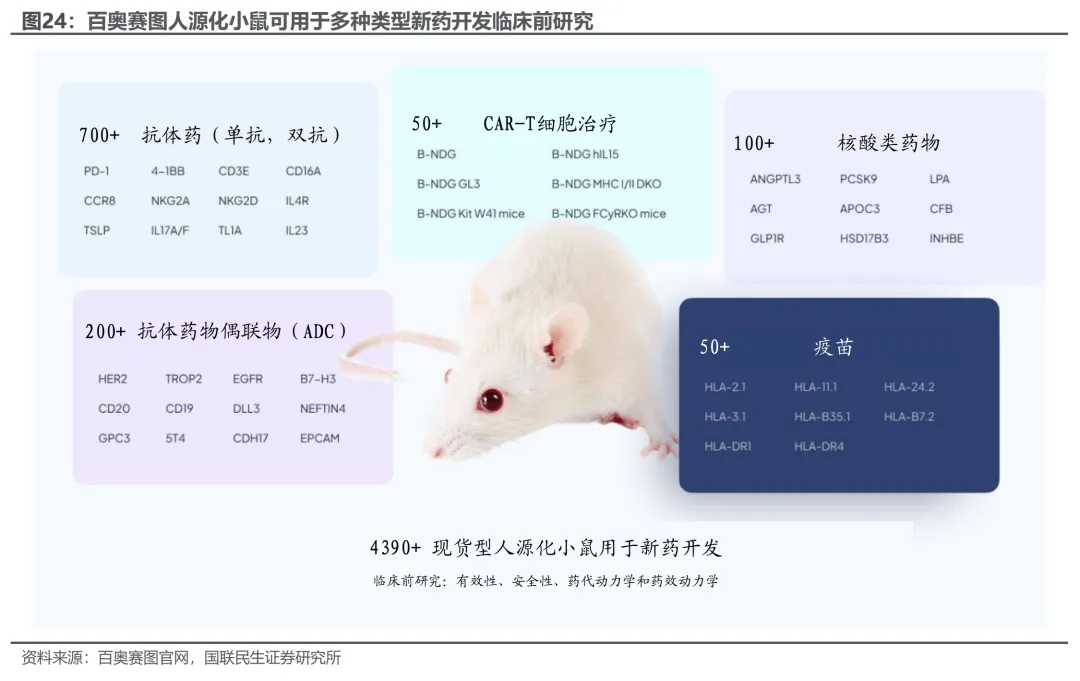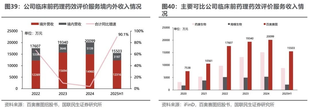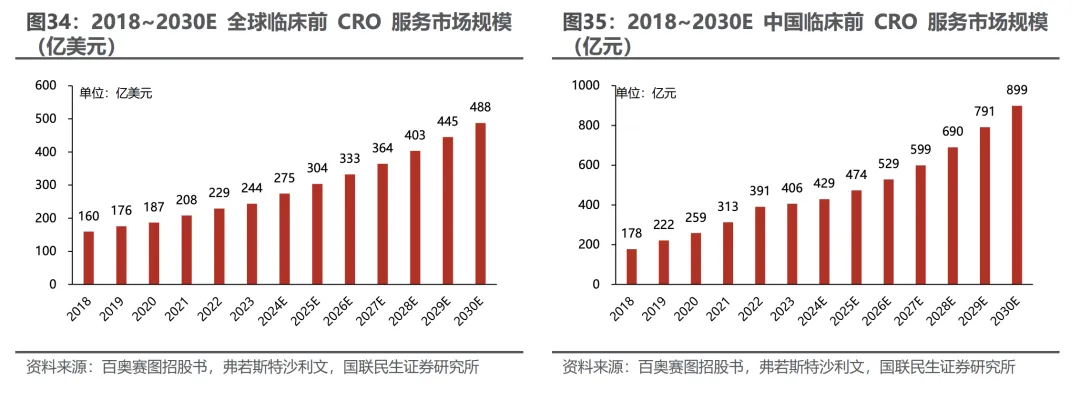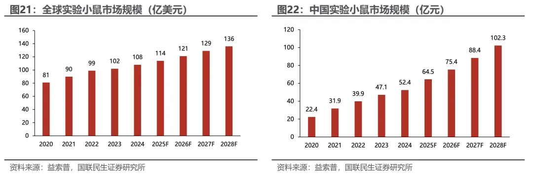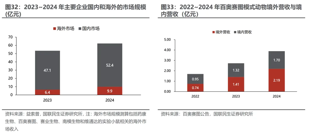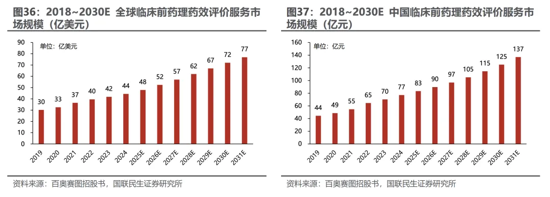 实验小鼠行业上游为政府机构及资源库、设备及用料厂商,中游为实验小鼠模型供应商,下游为科研机构和生物医药研发及CRO企业,各环节紧密协作,形成了一条高效协同、互为支撑的产业链。其中,中游的实验小鼠供应商是实验小鼠行业发展的核心力量,承担着实验小鼠生产、培育和供应的重任。百奥赛图不仅是国内领先的人源化实验小鼠供应商,还依托自身小鼠模型优势,直接为下游客户提供临床前CRO服务,形成更紧密的合作关系。全球实验小鼠市场稳定扩容,国产小鼠市场增速快于全球,增速波动主要与下游研发需求相关。全球实验小鼠市场规模超百亿美元,根据益普索《2024年中国实验小鼠行业蓝皮书》预计2024-2028年复合年均增长率为5.9%。美国作为全球生物医学研究的领跑者,拥有最大的实验小鼠市场,独占全球约6成市场规模。随着中国创新药行业快速发展,预计实验小鼠需求旺盛。2024年中国实验小鼠市场规模约52.4亿元,其中基因修饰小鼠已成为主要部分,占比56.9%,2028年,预计中国实验小鼠市场规模将突破百亿元,增势良好。百奥赛图小鼠品系丰富、覆盖面广,与临床前CRO业务相辅相成。百奥赛图提供的基因工程动物模型与细胞系产品,可模拟人类病理环境和调控机制,是药物开发过程中必不可少的工具。公司已开发超过4300种基因编辑大/小鼠及细胞模型,包括靶点人源化小鼠1700余种,并建立起符合AAALAC国际标准的模式动物生产中心,总使用面积约55000平方米,可年供应80万只小鼠。2025年上半年,公司模式动物销售收入2.74亿元,同比高增56.13%。药理药效评价业务属于模式动物销售业务的自然延伸,公司模式动物业务的快速扩张将进一步促进药理药效评价业务的发展。聚焦人源化小鼠领域,模式动物销售增长强劲且盈利能力佳。2024年公司靶点人源化小鼠通过销售和授权两种模式合计占该板块9成以上营收,是模式动物板块核心收入来源且保持高速增长。前瞻性布局海量靶点,人源化小鼠富有创新且品系多样。公司开展的“千鼠万抗”计划,针对千余个靶点进行规模化药物发现,其中大部分靶点此前尚未开发过。同时,公司针对大多数靶点开发了相应的人源化小鼠模型,大部分模型领先于大规模市场需求的增长而开发完成,进一步强化了公司在人源化小鼠领域的先发优势,提升了在行业中的竞争力。RenMab小鼠平台具备全球一流的人源化水平。百奥赛图的人源化小鼠模型性能业内领先,公司前瞻性针对大量靶点开发了相应的人源化小鼠,领先于大规模市场需求的增长,从而拥有先发优势。目前合计拥有超4390种现货动物模型,并已提供5300多种定制化动物模型,包括靶点人源化小鼠超1700种、重度免疫缺陷小鼠模型及二代产品、各类基础品系小鼠、KO小鼠以及工具鼠、老年鼠、疾病模型小鼠等,涵盖肿瘤、自身免疫、代谢和神经等疾病领域,可满足在靶点概念验证及机制研究、药物临床前体内外药理药效筛选等方面的需求。公司的动物中心每年可供应超80万动物,能够支撑业务快速扩张的需求。百奥赛图创新引领,出海势头强劲。国产小鼠海外市场销售额从2023年的6.4亿元增长至2024年的9.9亿元,增长率高达53.9%。百奥赛图是国产小鼠出海先锋,凭借源头创新的产品力及专业的服务水平,已与海外诸多大药企建立稳定的客户关系,模式动物业务境外营收快速增长,2022-2024复合年均增速达71.7%。2.3 临床前药理药效评价:协同动物模型优势,持续拓展全球客户群全球临床前CRO市场规模稳定扩容,中国增速快于全球。临床前CRO服务能显著降低药企新药开发的风险和成本,存在持续增长的市场需求。根据弗若斯特沙利文的数据,预计2026年和2030年全球临床前CRO市场规模将分别达到332.5亿美元和487.5亿美元,2023-2026年及2026-2030年的CAGR分别为10.9%及10.0%。预计中国临床前CRO市场规模于2026年及2030年将分别达到528.6亿元以及899.3亿元,2023-2026年以及2026-2030年CAGR分别为9.2%和14.2%。我国CRO行业由于起步晚,可供借鉴的国外经验充足、创新改革、工程师红利等多种原因,行业增速超过全球市场。根据弗若斯特沙利文数据,2024年全球临床前药理药效评价行业市场规模约 44.4亿美元,预计2031年将增至76.9亿美元,2024-2031E的复合增长率为 8.2%。2024年中国临床前药理药效评价行业市场规模约77.1亿元,预计2031 年将增至137.1亿元,2024-2031E的复合增长率为 8.6%。百奥赛图动物模型优势显著,助力临床前药理药效评价业务增长。百奥赛图拥有完备的体内外药理药效学评价、药代动力学(PK)和药效学(PD)评价以及小动物病理和毒理学评估体系,涵盖肿瘤、自身免疫、代谢、炎症等多个疾病领域,服务于抗体、ADC、细胞疗法、基因疗法、核酸药物、疫苗等药物临床前研发,最终产品为相关服务的检测报告。丰富且前沿的模式动物疾病模型为公司临床前药理药效评价服务提供显著竞争优势。截至25H1,公司的药理药效团队已为全球约950名合作伙伴完成了超过6350项药物评估,并协助完成若干IND申报工作。海外市场加速渗透,25H1海外收入占比79%。临床前药理药效评价服务团队人员170人,主要分布在北京、海门及美国波士顿,2018年美国波士顿子公司成立后境外临床前CRO业务实现快速发展。目前公司已与全球前十大药企中的9家在药理药效板块建立合作关系,2025H1公司该业务板块收入同比增长90.1%,客户留存率(按销售金额计算)达到79