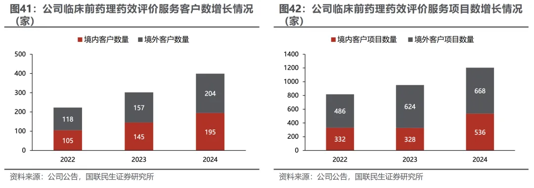 临床前药理药效评价:随着公司动物模型资源不断丰富、客户认可度提高,临床前药理药效业务量持续增长。临床前药理药效评价收入由2020年的0.75亿元增至2024年的2.01亿元,CAGR为27.79%。2024年受市场竞争加剧影响,该项业务单价有所下滑,收入增速有所放缓,毛利率亦有所下滑。受益于下游药企加大研发投入,公司客户数大幅增加,2025H1实现收入1.55亿元(同比+90.10%)。