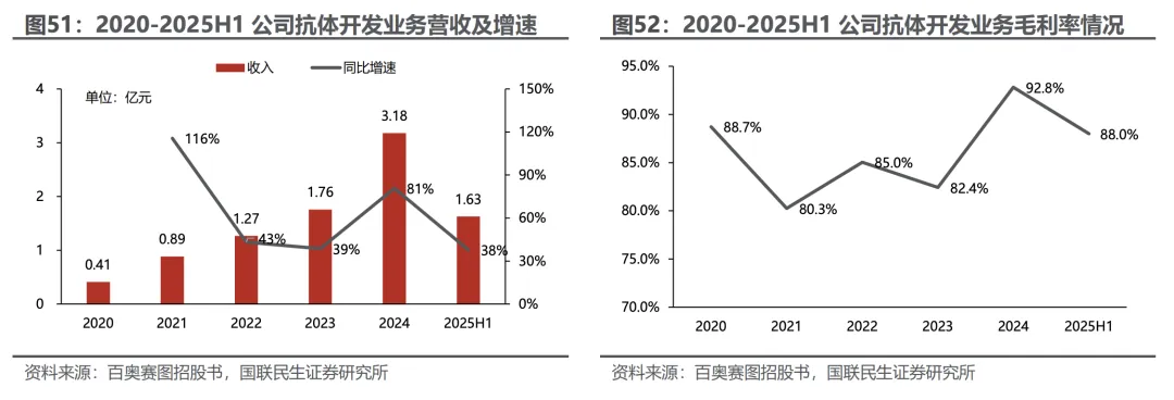 抗体开发业务:涵盖抗体发现、抗体筛选、抗体分析与抗体制备等各个环节,受益于RenMice技术平台及海量抗体库,抗体开发业务收入由2020年的0.41亿元增至2024年的3.18亿元(CAGR为66.76%)。2025H1,抗体开发业务收入达1.63亿元,同比增长37.79%。随着公司抗体开发合作客户数量及签约的抗体分子数量逐步增加,抗体开发业务有望持续贡献业绩弹性。