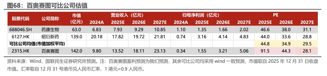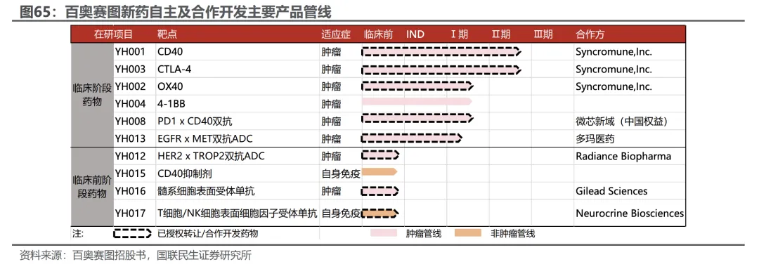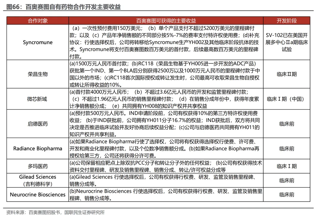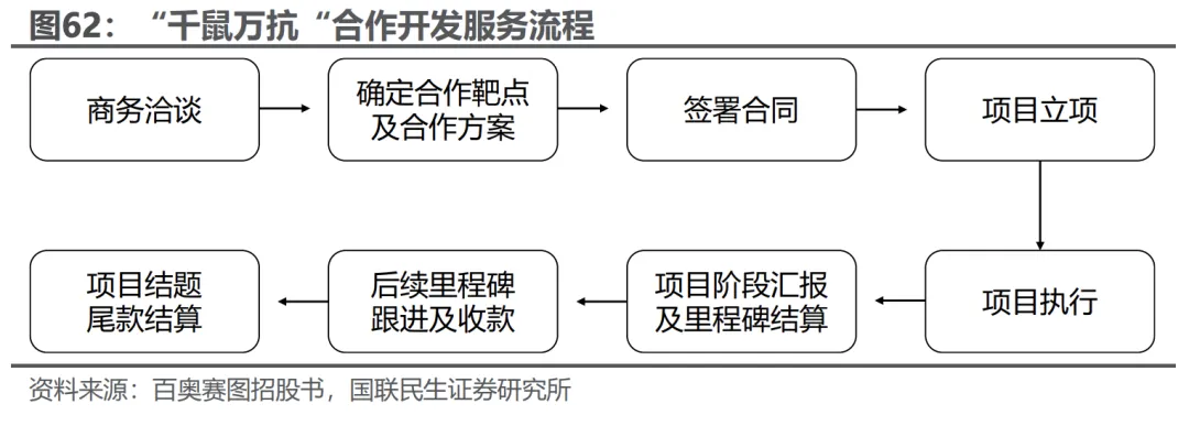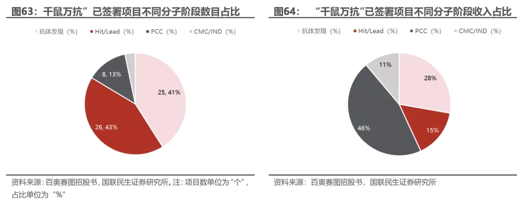 RenMab:高效、安全的100%人源化单抗开发平台。RenMab是目前已知人源化程度最高的小鼠平台之一,具有完整的人源抗体基因重、轻链可变区片段。RenLite:高组装正确率,提升双抗及双抗ADC开发效率。RenLite 为在 RenMab基础上开发的共同轻链小鼠,用于全人源双抗的发现。RenLite 可产生与人体类似的重链多样性,采用单一人类共同κ轻链确保了开发双抗的轻链互补性,在避免了体外人源化改造的同时,解决了重、轻链错配的问题,组装正确率超95%,简化了开发过程。双抗分子增加连接子和毒素分子,可进一步形成双抗ADC分子。RenNano:应用广泛的人源化仅重链抗体及纳米抗体开发平台,助力破解难治疾病。RenNano可以直接产生丰富多样性及高亲和力的全人仅重链抗体,节省了大量的时间和费用,并可用于高效构建双抗/多抗、CAR-T等。RenTCR:筛选并开发高亲和力、高特异性的TCR药物。RenTCR是基于公司的SUPCE技术,将人源TCR(T细胞受体)序列导入小鼠体内,并对鼠源的主要组织相容性复合物MHC I或/和MHC II进行人源化,保证小鼠可以产生正常的T细胞免疫应答。该平台可用于筛选高特异性/亲和力的TCR,成药形式可以是TCR-T或者TCR蛋白药物等,也可用于新表位发现,打破TCR治疗靶点局限性。RenTCR-mimic:颠覆性获取类TCR抗体用于肿瘤靶向治疗。百奥赛图的类TCR抗体技术平台可用于发现具有比内源性TCR更高亲和力和特异性的TCRm抗体。公司在RenMice系列小鼠的基础上定点敲入了人源主要组织相容性复合物(HLA)基因序列生成RenTCR-mimic小鼠,通过特定的免疫方式可产生只识别指定多肽和HLA形成复合区域的类TCR抗体。RenTCR-mimic小鼠颠覆性的改变了类TCR抗体获取方法,相比传统的文库多轮筛选方法,通过特定抗原免疫可以快速获得靶向抗原肽-MHC复合物的全人抗体序列。类TCR抗体可以靶向细胞内异常蛋白包括肿瘤相关抗原,癌症睾丸抗原,突变蛋白抗原和病毒肿瘤抗原等,突破了抗体药物只能针对细胞膜表面和分泌蛋白的限制。3.2 千鼠万抗”:建成百万级抗体库,打造抗体业务增长引擎高通量建设“抗体货架”,从源头提升药物开发效率。创新药研发具有高度不确定性,从源头创新的研发工作具有极高风险,若靶点或药物分子在后续过程中被证实无法成药,药企将承受很高沉没成本。根据弗若斯特沙利文数据,药物早期发现过程通常耗时3-5 年甚至更久。百奥赛图“千鼠万抗”计划,已针对1000余个潜在抗体药物靶点,形成了百万级高质量抗体分子库,药企根据目标靶点,可直接从结合表位丰富的抗体货架中挑选合适的抗体,省去了早期发现及开发的过程,显著节省研发时间并降低早期研发的不确定性。同时,“抗体货架”允许药企同步比较多个靶点的优劣,通过将实验数据和MOA相结合,更高效地筛选出最有潜力的靶点,提高研发效率及临床转化的成功率。公司依托RenMab及RenLite平台,可大批量制备及筛选抗体。百奥赛图通过逐一敲除RenMab(或RenLite)小鼠潜在抗体药物靶点基因(肿瘤、炎症及自身免疫、代谢等疾病),获得基因敲除小鼠,然后对这些小鼠进行免疫可获得多表位、多物种交叉识别抗体,且产生的抗体分子的多样性将显著增加,可识别并结合人鼠同源与非同源序列表达的靶点表位。大部分靶点的人鼠同源性超过60%,40%以上靶点的人鼠同源性超过80%。(1)通过利用千余种靶点敲除RenMab 或 RenLite 小鼠,通过小鼠抗原免疫的方式完成针对1000余个靶点的抗体制备;(2)采用多物种(人、鼠、大动物)抗原交叉免疫的方式(如需),筛选出对多物种靶点亲和力相近的抗体。此类抗体可交叉识别不同种属体内的靶点,若识别人类的抗体分子又可识别小鼠,则后续临床前药理药效评估可直接使用野生型小鼠而非靶点人源化小鼠进行,极大节省制药企业的时间以及经济成本;(3)对筛选出的抗体,进一步在体外进行亲和力筛选、结合检测、内吞实验以及生物活性检测等,形成多样性丰富的抗体库,以进行对外授权/转让;(4)根据合作伙伴的进一步需求(如有),对某个靶点获得的数百个抗体进行小鼠体内药效筛选以及大动物体内验证,找到针对该靶点药效及安全性最好的1-2个 PCC分子,择优推进CMC流程及IND申报。“千鼠万抗”前期大规模投入开花结果,商业化加速进入收获期。“千鼠万抗”项目的前期建设需要大量资金投入,随着百万级抗体库已建设完善,公司商业化进程加速推进,为公司持续贡献高毛利率的优质营收。此外,公司后续还将继续基于 RenNano、RenTCR、RenTCR-mimic等技术平台,推出纳米抗体、TCR抗体及类TCR抗体等潜在的创新成药形式的分子,扩展“千鼠万抗”计划所形成的抗体库的丰富度,并通过招募AI专业人才、本地化部署AI平台从而加强对“千鼠万抗”项目的AI赋能。公司已与 Merck KGaA(德国默克)、Gilead Sciences(吉利德科学)、IDEAYA Biosciences、Neurocrine Biosciences、翰森制药、正大天晴、华润生物、荣昌生物、ADC Therapeutics、Myricx Bio、ABL Bio、上海生物制品研究所等数十家海内外知名生物科技或医药研发企业达成抗体分子转让/授权或合作开发。截至2025年H1,公司合计签署转让/授权/合作开发项目61个,相应抗体分子属于抗体发现、Hit(苗头化合物)/Lead(先导化合物)以及PCC阶段(合同签署时研发阶段)的项目分别为25个、26个以及8个,2个项目处于IND/ CMC等研发阶段。3.3 新药自主及合作开发:分阶段收获稳定开发收益,长期共享高潜力销售分成发