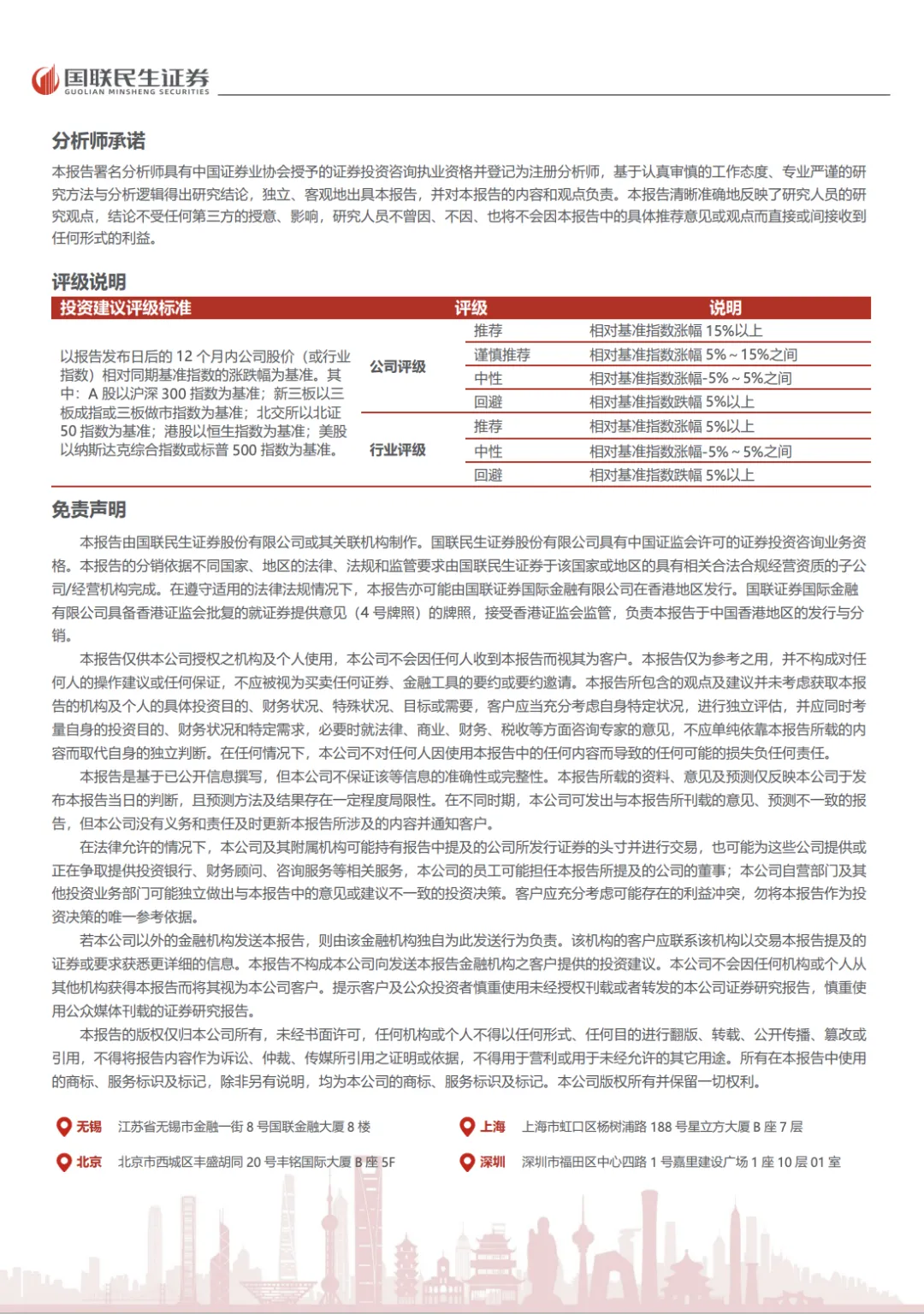本平台及国联民生证券研究报告所载资料的来源及观点的出处皆被国联民生证券认为可靠,但国联民生证券不对其可靠性、准确性、时效性或完整性做出任何保证。本平台推送内容仅反映国联民生证券研究人员于发出完整报告当日的判断,本平台所载的资料、意见及推测有可能因发布日后的各种因素变化而不再准确或失效,国联民生证券不承担更新不准确或过时的资料、意见及推测的义务,在对相关信息进行更新时亦不会另行通知。在任何情况下,本平台所载信息、意见不构成对任何人的投资建议,所述证券或金融工具买卖的出价或征价,评级、目标价、估值、盈利预测等分析判断亦不构成对具体证券或金融工具在具体价位、具体时点、具体市场表现的投资建议。本平台所包含的观点及建议并未考虑获取本平台包含信息的机构及个人的具体投资目的、财务状况、特殊状况、目标或需要,客户应当充分考虑自身特定状况,进行独立评估,并应同时考量自身的投资目的、财务状况和特定需求,必要时就法律、商业、财务、税收等方面咨询专家的意见,不应单纯依靠本报告所载的内容而取代自身的独立判断。在法律允许的情况下,国联民生证券及其关联方可能持有本平台推送内容中提及的公司所发行证券的头寸并进行交易,也可能为这些公司提供或正在争取提供投资银行、财务顾问、咨询服务等相关服务。客户应充分考虑可能存在的利益冲突,勿将本平台推送内容作为投资决策的唯一参考依据。对任何直接或间接使用本平台所载信息和内容或者据此进行投资所造成的任何一切后果或损失,国联民生证券及/或其关联人员均不承担任何形式的法律责任。
