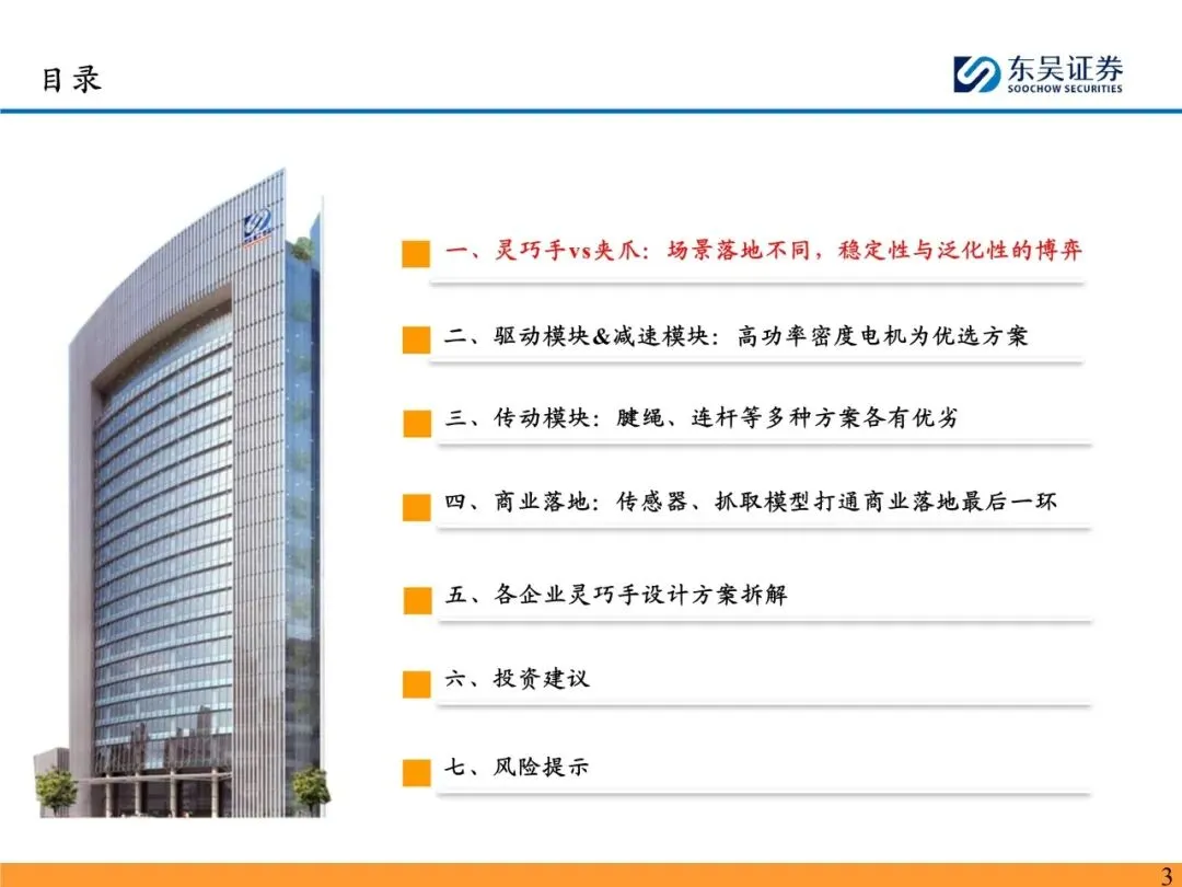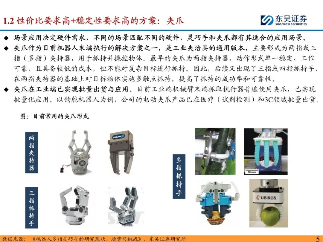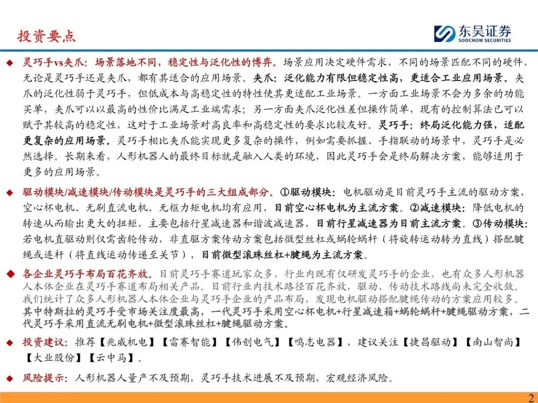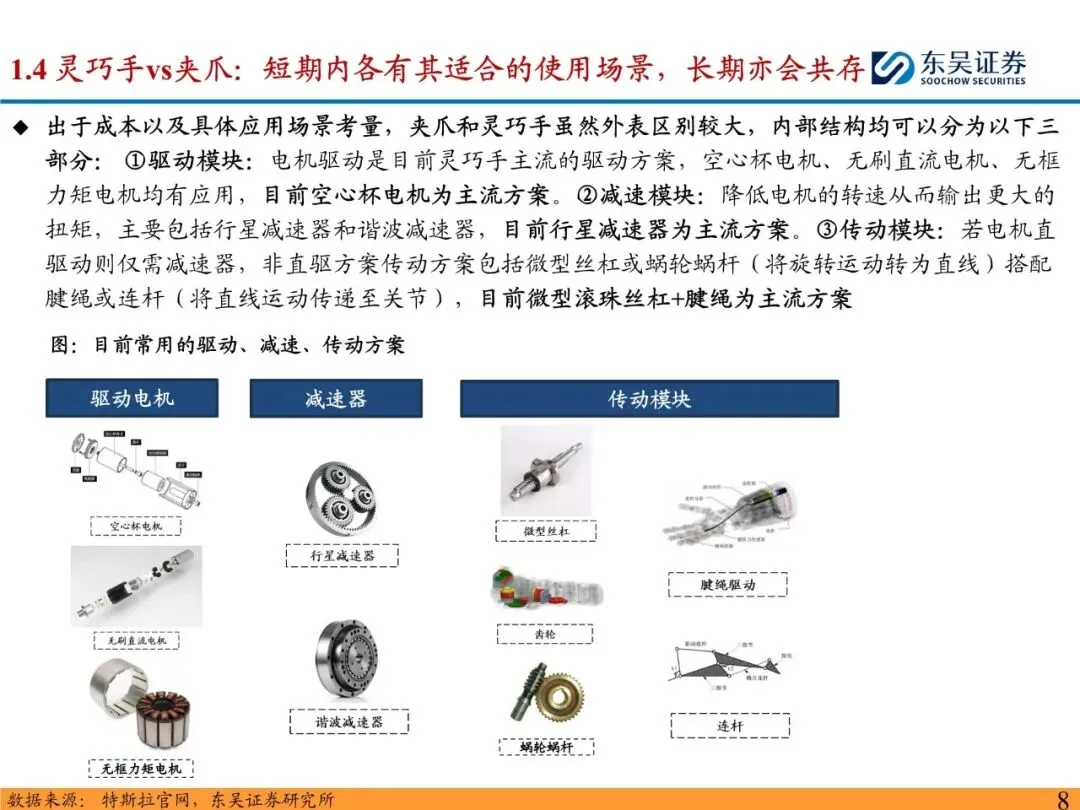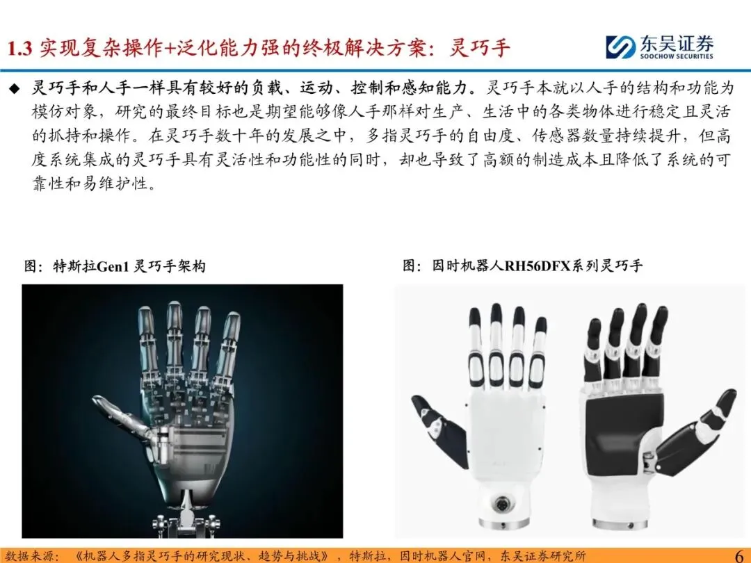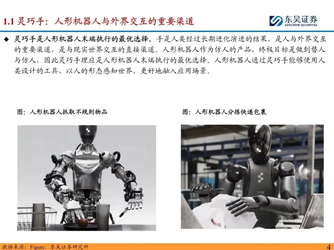 灵巧手是人形机器人末端执行的最优选择。手是人类经过长期进化演进的结果,是人与外界交互的重要渠道,是与现实世界交互的直接渠道。人形机器人作为仿人的产品,终极目标是做到替人与仿人,因此灵巧手理应是人形机器人末端执行的最优选择。人形机器人通过灵巧手能够使用人类设计的工具,以人的形态感知世界,更好地融入应用场景。