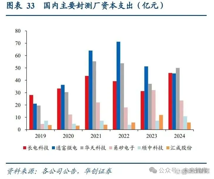 需求牵引平台升级,国产先进封装从“跟跑”向“并跑”迈进。早期本地先进封装平台基础相对薄弱,在2.5D/3D、Chiplet互联等关键工艺环节技术积累有限,曾一度依赖台积电、三星等海外封装方案,例如,据半导体产业纵横报道,华为曾是台积电首个CoWoS客户;三星披露百度的首代昆仑芯片也采用了其I-Cube技术进行封装。近年来中国芯片设计产业快速发展,AI加速器、通用GPU、车规SoC等高性能芯片方向取得显著进展,先进芯片设计需求反向推动本土封测厂商加快平台建设与工艺迭代,封装平台能力正成为国产高端芯片实现产业化的关键支点。国内领先企业加速追赶业内龙头厂商,近年来资本支出显著提升。集成电路产业具有技术开发、更新换代快的特点,要封装企业紧随产业链上下游的技术步伐,需投入大量资金用于开发先进的封装技术。国内封装龙头在生产规模和技术水平上不断追赶业内龙头厂商,资本支出有所提升,资本密集度较高。其中2024年长电科技、通富微电、华天科技的资本支出分别为45.91、45.54、50.01亿元,占营业收入比例分别为13%、19%、35%。