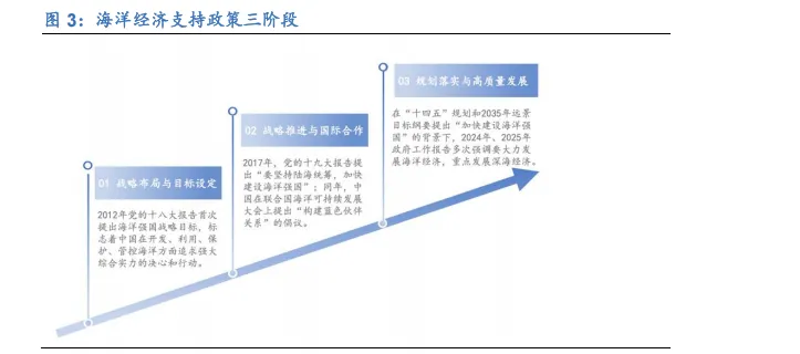 “海洋强国”战略逐步落地实施。近年来,国家持续出台多项针对海洋经济的扶持政策,系统性地推进海洋资源的开发利用与海洋产业的结构升级。从政策演进的时间轴来看,中国的海洋经济战略大致可划分为三个阶段:第一阶段以 2012 年《海洋经济发展“十二五”规划》为起点,初步确立了将海洋经济作为国家发展重点的战略方向;第二阶段在“十三五”期间提出“建设海洋强国”目标,标志着国家对海洋发展重心的全面提升;第三阶段进入“十四五”以来,政策开始向具体落实层面倾斜,围绕重点区域、重点产业和重点技术展开精准支持。在政策内容层面,国家支持的广度与深度不断拓展,包括经济发展示范区的建立、海洋经济指标体系的构建与各项关键技术的持续创新,为深海科技的发展提供了坚实的产业基础。