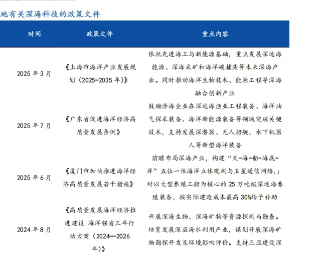 在国家战略引导和政策支持下,多地积极布局深海科技领域。在国家战略引导和政策体系完善的背景下,各地政府正将深海科技作为培育未来产业和增强区域竞争力的重要方向,纷纷出台专项规划与配套措施,推动深海领域加快布局。从装备制造到能源开发,再到深远海养殖和观测网络建设,政策的密集落地为深海科技创新提供了制度保障与发展动力,促进技术攻关、产业集聚与多元化应用协同推进,进一步夯实深海产业发展的区域基础。