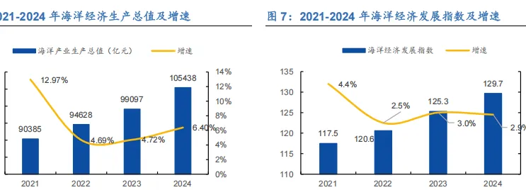 作为新兴产业,海洋经济的市场规模呈现出“稳中提速”的特征。《2024 年中国海洋经济统计公报》显示,2024年全国海洋生产总值105438亿元,比2023年增长5.9%,增速比国内生产总值高 0.9 个百分点,占国内生产总值比重为 7.8%。《2025 年中国海洋经济发展指数》数据显示,2024 年中国海洋经济发展指数为 125.2,比上年增长 2.3%,海洋治理能力得到有效提升。涉海企业 IPO 融资规模达 114 亿元,占全部IPO 企业融资规模的 17.0%,海洋产业融资市场表现活跃。