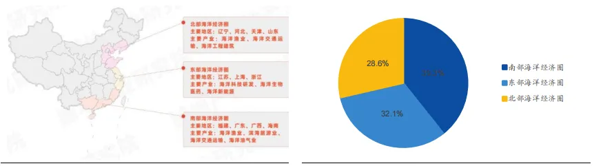我国海洋经济呈“三圈”格局。基于不同地区的经济联系和资源禀赋,我国海洋经济圈主要划分为三大区域,即北部、东部和南部三大海洋经济圈。北部海洋经济圈主要包括辽宁、河北、天津、山东等地区,重点发展海洋渔业、海洋交通运输、海洋工程建筑等产业。东部海洋经济圈以上海为中心,涵盖江苏、浙江,以海洋科技研发、海洋生物医药、海洋新能源等产业为主。南部海洋经济圈由福建、广东、广西、海南组成,主要发展海洋渔业、滨海旅游、海洋交通运输、海洋油气等产业。截止 2024 年,南部海洋经济圈生产总值占比最多,比重为 39.3%;东部海洋经济圈占全国海洋生产总值的比重为 32.1%;北部海洋经济圈海洋占全国海洋生产总值的比重为 28.6%。