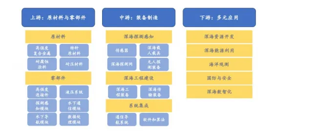 目前,深海科技形成了“上游原材料与零部件-中游装备制造-下游多元应用”的完整产业链。其中,上游主要包括关键原材料与核心零部件的研发与生产,中游集中在深海探测感知、深海工程建设与系统集成三个方面,下游则覆盖了深海资源开发、海洋环境监测等多领域应用场景,形成从基础材料到系统总成再到终端应用的完整闭环。