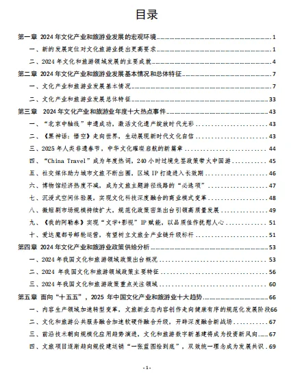 2024 年中国文化产业和旅游业在宏观经济环境深刻变革的背景下,迎来了新的发展机遇与挑战。从宏观环境来看,党中央对文化旅游业的重视程度不断提高,赋予其新的发展定位和使命;经济与人口结构的变化既为产业发展提供了动力,也提出了新的要求;产业转型升级的关键期与国际局势的变动促使文化旅游业不断创新和拓展。在发展现状方面,文化产业和旅游业的市场总体情况呈现出产业增加值占比稳步提高、市场主体数量持续上升、旅游市场强劲复苏等积极态势;文旅新业态如数字文旅、低空文旅、康养旅游等蓬勃发展;文旅消费情况显示出文娱消费支出提升、夜间消费和网络视频消费增长等特征;文旅服务贸易发展显著,文化出海潜力巨大;文旅国际传播能力不断增强。总体特征上,供给端更加完备,新兴产品不断涌现;消费端新型文旅消费成为扩内需、促消费的主战场;业态端新业态新场景带来深刻变革;市场端网络声量持续放大,但需警惕“旺丁不旺财”等现象。2024 年文化产业和旅游业的十大热点事件反映了行业的创新与活力。政策供给分析表明,我国文化和旅游领域的政策在主体、数量、类型、出台密集程度和涵盖领域等方面都呈现出积极的变化,政策特征和重点关注领域为产业发展提供了明确的方向和支持。展望 2025 年,文化产业和旅游业将在内容生产、公共服务融合、前沿技术应用、文旅项目发展、消费趋势、开放机遇、人口结构影响以及人才培养等多个方面展现出新的趋势。这些趋势将引领产业在变革中寻找机遇,在机遇中谋求更高水平的发展,为推动中国经济的高质量发展、满足人民对美好生活的新期待以及提升国家文化软实力做出更大的贡献。