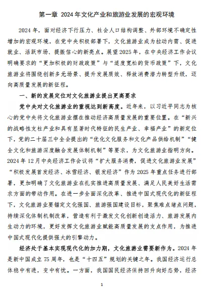 党中央对文化旅游业的重视程度不断攀升,将其定位为新兴的战略性支柱产业和民生产业、幸福产业。党的二十届三中全会提出要优化文化服务和产品供给机制,健全文化和旅游深度融合发展体制机制。2024 年中央经济工作会议更是将扩大服务消费、促进文化旅游业发展列为 2025 年的重点任务,明确了文化旅游业在推进高质量发展、满足人民美好生活需求方面的引领作用。在经济处于基本实现现代化的加力期,文化旅游业需要通过创新多元场景、提升发展质效、释放消费潜力来转型升级。面对经济下行压力、社会人口结构调整以及外部环境不确定性增加等诸多挑战,文化旅游业被赋予了新的使命,需要锚定文化强国、旅游强国建设目标,聚焦难点堵点问题,持续深化体制机制改革,营造有利于激发文化创新创造活力和旅游发展内生动力的环境,为推进中国式现代化提供强大动力。