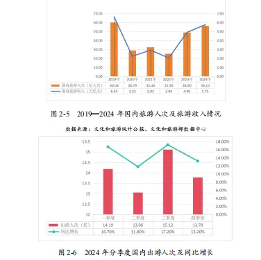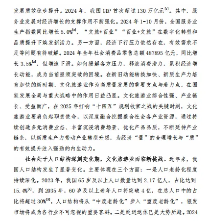 2024 年中国经济运行总体稳中有进,GDP 首次超过 130 万亿元,服务业发展对经济增长的支撑作用不断强化,为文化旅游业的发展提供了坚实的经济基础。然而,经济下行压力依然存在,有效需求不足等问题有待破解,这要求文化旅游业在新旧动能转换加快、新质生产力培育加快的新时期,肩负起拉动内需、促进经济循环活力的职责使命,以深度融合挖掘整合社会各产业资源,延伸产业链条,带动产业转型升级。同时,我国人口结构发生了显著变化,人口老龄化程度持续深化,65 岁及以上人口数量不断增加,银发市场成为不可忽视的重要客群。延迟退休政策的实施以及人口代际结构的转型,使得文化旅游业面临新挑战,需要发展个性化、多元化、差异化的银发旅游产品,推动文化旅游服务的适老化改造和无障碍设计,加快老年旅游市场品质提升,释放银发人群消费潜力。
