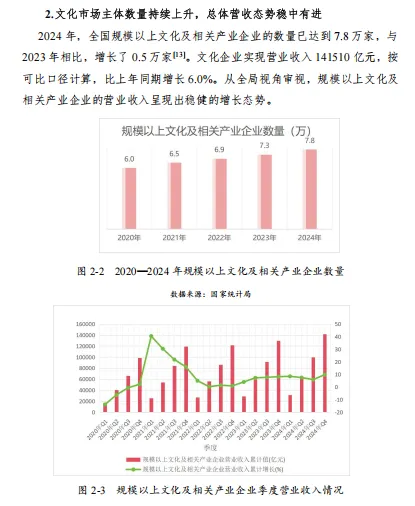 文化市场主体数量持续上升 2024 年,全国规模以上文化及相关产业企业数量达到 7.8 万家,与 2023 年相比增长 0.5 万家,文化企业实现营业收入 141510 亿元,按可比口径计算,比上年同期增长 6.0%。文化核心领域实现营业收入 92644 亿元,比上年同期增长 6.3%;文化相关领域 48865 亿元,增长 5.5%。文化核心领域在整个文化产业中的重要性不断凸显,产业资源配置和市场影响力不断增强。