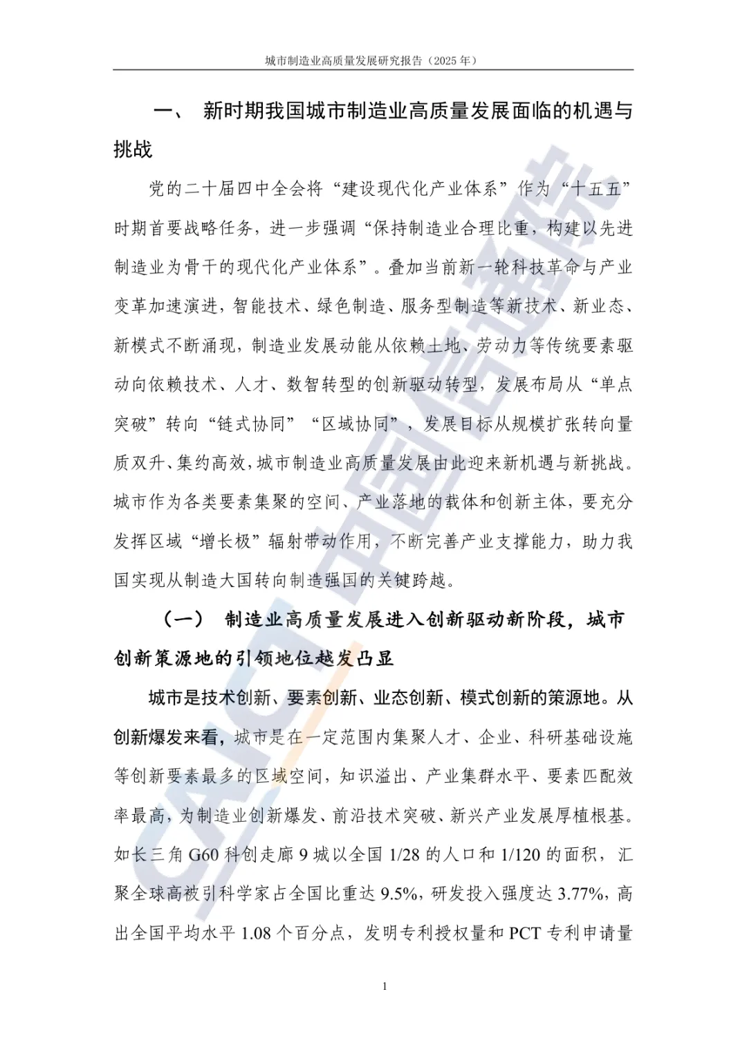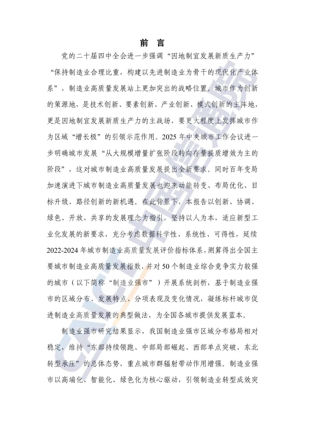 2025城市制造业高质量发展研究报告:新质生产力引领转型,集群协同成核心动能!报告覆盖50个制造业强市,呈现“东部领跑、中部崛起、西部突破、东北转型”格局,高端化、智能化、绿色化成为转型核心方向。