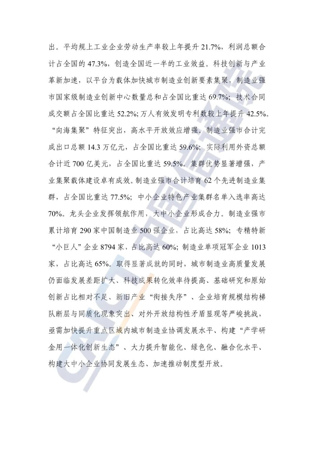 区域格局稳定:50个制造业强市呈现“东部36席领跑、中部10席崛起、西部2席突破、东北2席转型”态势,长三角、粤港澳等重点城市群辐射带动作用显著。 转型成效突出:平均规上工业企业劳动生产率提升21.7%,利润总额占全国47.3%;5G工厂、绿色工厂数量占全国比重分别达57.8%、38.8%,智能化绿色化转型加速。 创新与开放双强:国家级制造业创新中心占全国69.7%,万人有效发明专利数提升42.5%;出口总额占全国59.6%,实际利用外资占比59.5%,“向海集聚”特征明显。