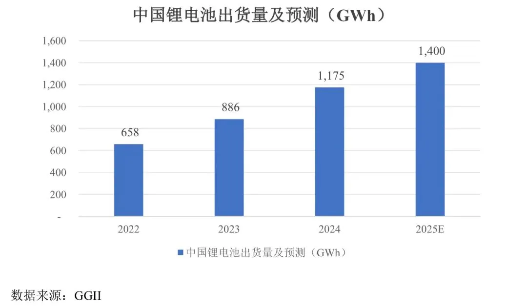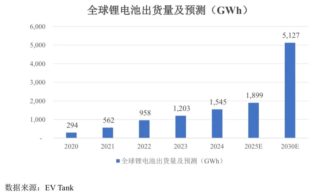 从全球锂电池出货量情况来看,研究机构 EV Tank 发布的《中国锂离子电池行业发展白皮书(2025 年)》数据显示,2024 年,全球锂电池总体出货量1,545.1GWh,同比增长 28.5%。从出货结构来看,2024 年,全球汽车动力电池出货量为1,051.2GWh,同比增长 21.5%;储能电池出货量369.8GWh,同比增长64.9%;小型电池出货量124.1GWh,同比增长 9.6%。预计到 2025 年全球锂电池出货量将达到1,899.3GWh,2030 年全球锂电池出货量将达到 5,127.3GWh。