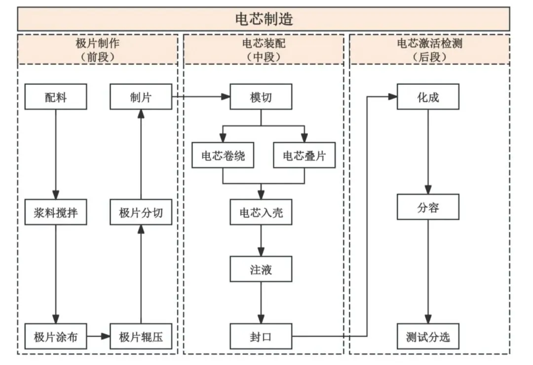 锂电池的生产工艺流程可分为电芯制造和模组 Pack 制造两大阶段。其中,电芯制造又包括前段工序(极片制造)、中段工序(电芯装配)和后段工序(化成分容)三个阶段。电芯制造的前段环节主要包括制浆、极片涂布、极片辊压、极片分切等工序,是动力电池制造的基础,对极片制造设备的性能、精度、稳定性、自动化水平和生产效能等有着很高的技术要求;电芯制造的中段环节主要包括卷绕/叠片、电芯入壳、烘干、焊接、封装等工序,对精度、效率、一致性要求较高;电芯制造的后段环节主要包括化成、分容、检测分选等工序。