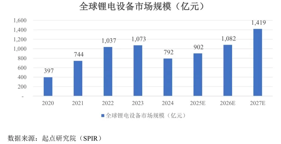 2020 年以来,随着新能源汽车、储能及 3C 市场的发展,动力电池、储能电池和3C 电池市场需求均呈逐年增长的趋势,锂电池行业发展前景良好,锂电池生产企业纷纷制定和实施扩产计划。根据起点研究院(SPIR)数据,2024 年全球锂电池设备规模为792 亿元,同比下降 26.2%。下降主要原因为下游锂电池企业扩产进度放缓及锂电设备价格下降。前两年锂电池行业处于竞争白热化状态,内卷加剧,但长期来看,下游新能源汽车及储能市场对锂电池需求增长明确,同时叠加退役设备的更新换代及产线改造,锂电池设备需求未来 2-3 年将呈持续增长态势。